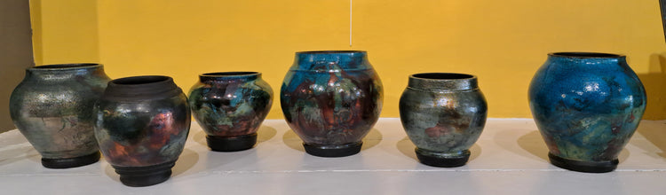 "I have taken daily walks in my local forest over the last twenty years, seeking sanctuary through its silence and the beauty of its mature pine trees. I experienced first-hand the devastation caused through wildfires when acres were wiped out during the hot summer of 2022. My current collection was created for my final university show in June 2024 ‘Burnt Forest Reborn’, inspired by the fragile beauty of the forest. I aim through my artwork to raise awareness of environmental issues and highlight the recent devastation of forests caused by wildfires due to climate change. Handmade ceramics are informed from shapes and textures found in nature. Focusing on the Raku glazing method captures the strength and resilience of nature. Glazes are applied as gestural marks creating movement and energy translating as regrowth against great odds. These ceramic vessels are fired several times to create variation and depth in colour and tone. Glazes and oxides are layered resulting in tactile textures making each vessel a one-off piece of art"