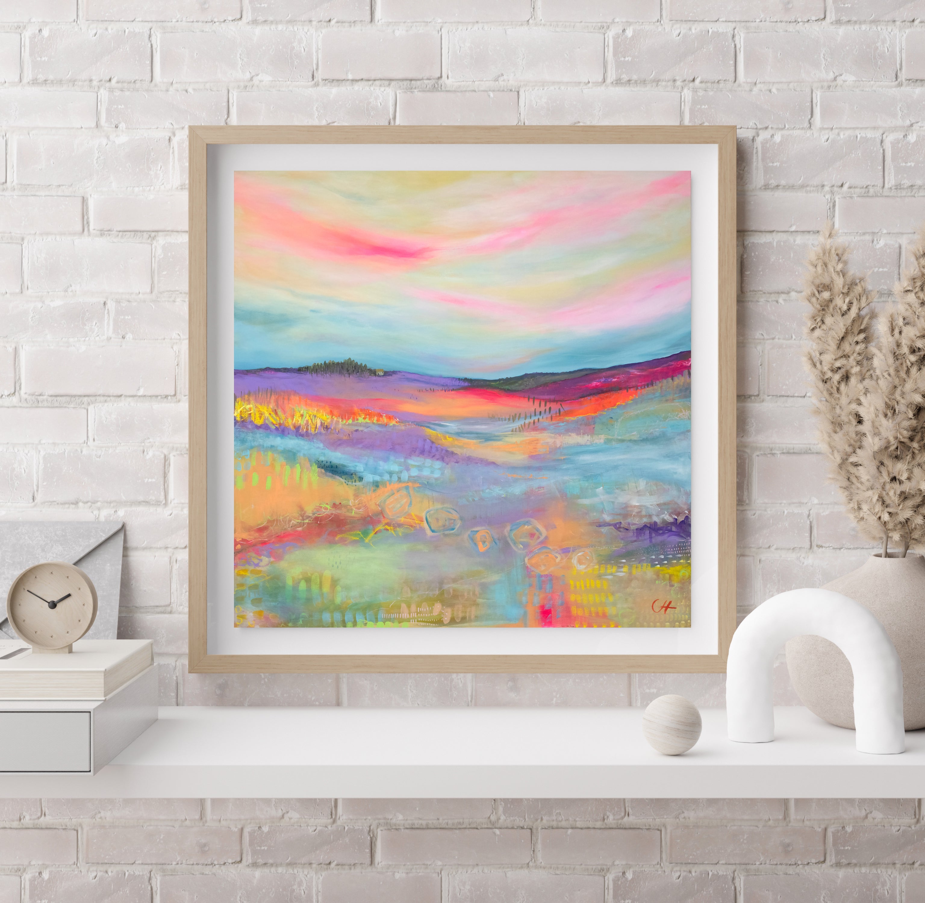Her vast imagined landscapes transport you to view an alternative euphoric realm. Using acrylics in striking neon and mixed media Christine is influenced by the surrounding landscapes and her interpretation of them and composes each piece as a way of expressing her memories as 'Snippets of Time'.