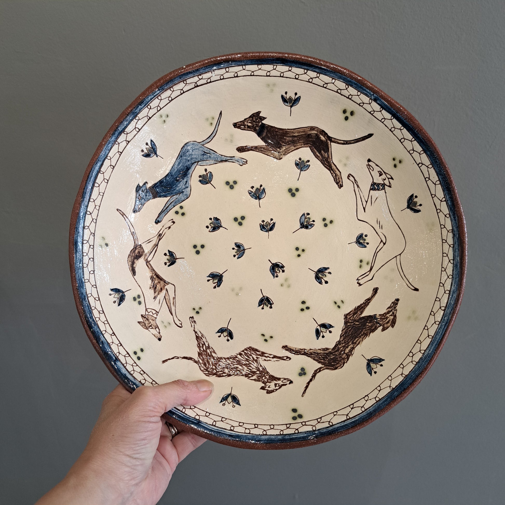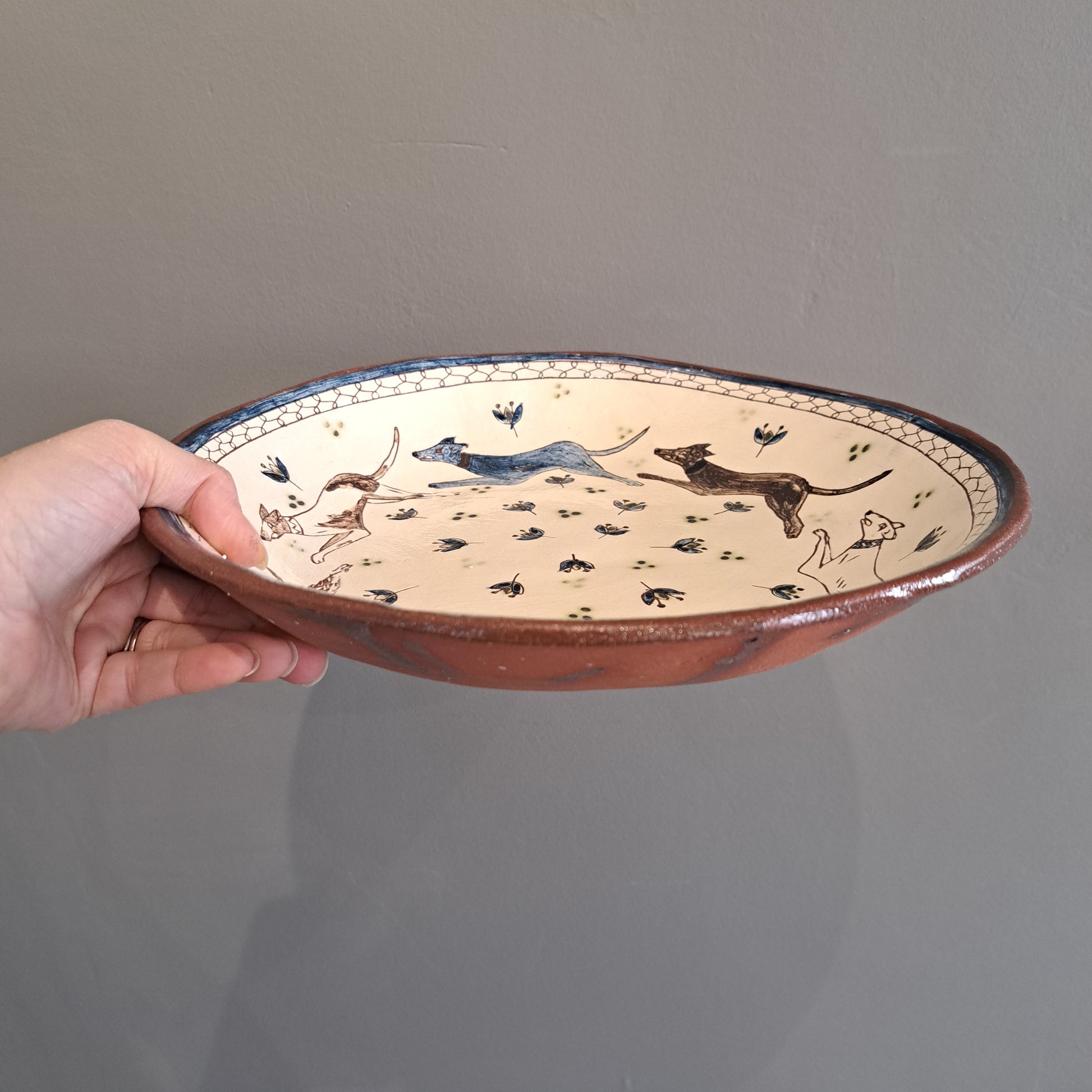 Slipware decorated running dog / greyhound, Scraffito bowl decorated with raw iron, cobalt and copper oxide. Decorated with a technique called sgrafitto. Terracotta Clay.