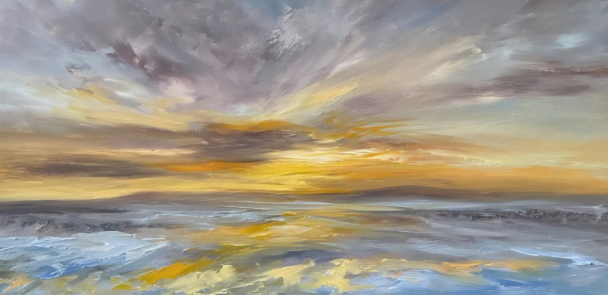 A soft and gentle depiction of a delicious sunrise across a winter landscape with the rays of the sun reflected in the frosty ground. One to make time stand still and pause a while.