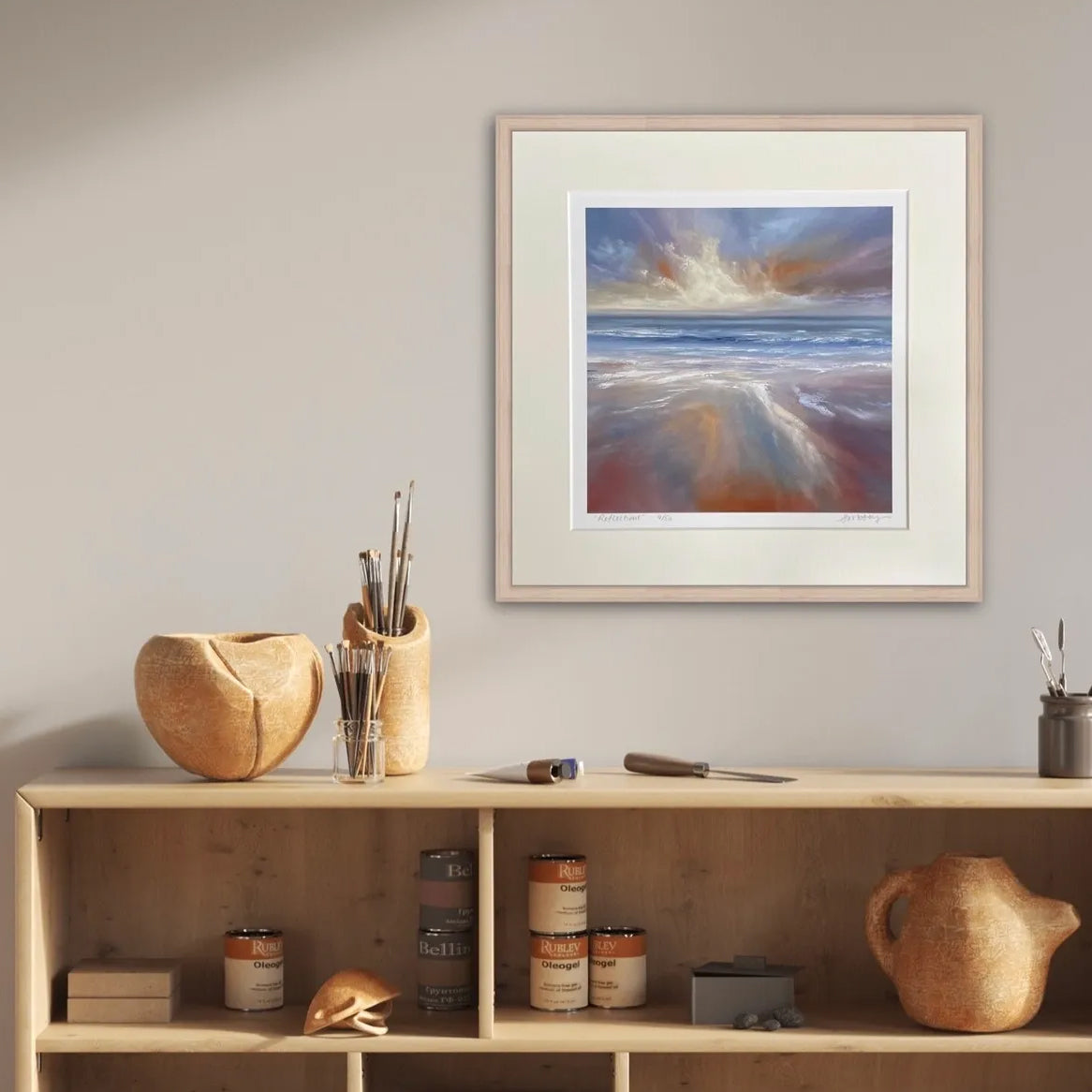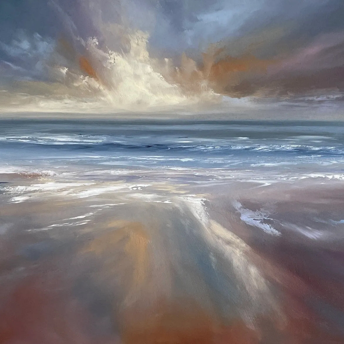 The painting was all about reflections in wet sand as the tide went out and left a sandy mirror to reflect the clouds and the colours of the sky. You may know that I'm a lover of skies and my usual compositions are all about the drama that happens in them. In this painting I wanted to have less sky but to capture that drama through the form of reflections.