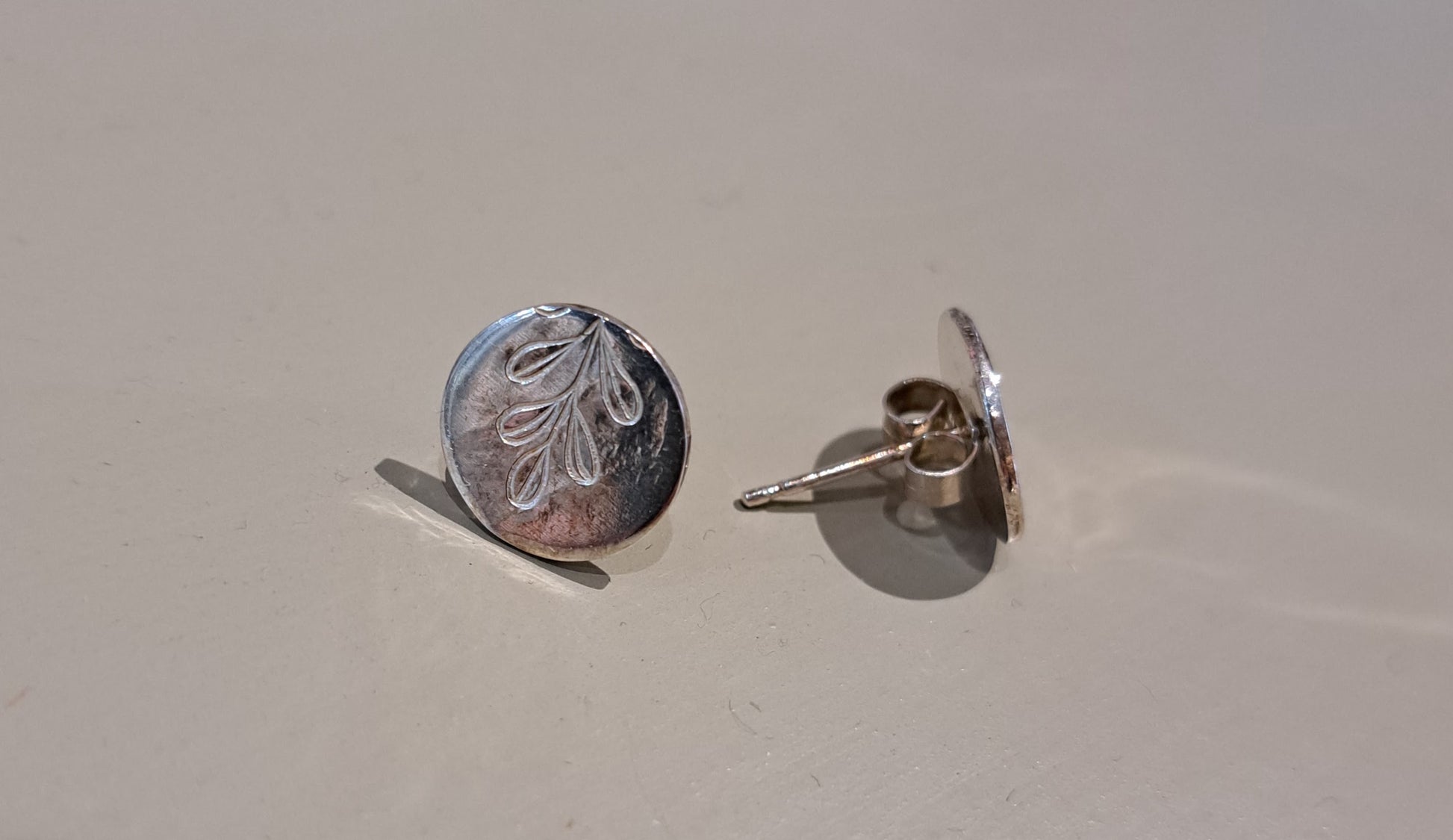 Dainty sterling silver stud earrings embossed with a leaf design, approx 1cm across