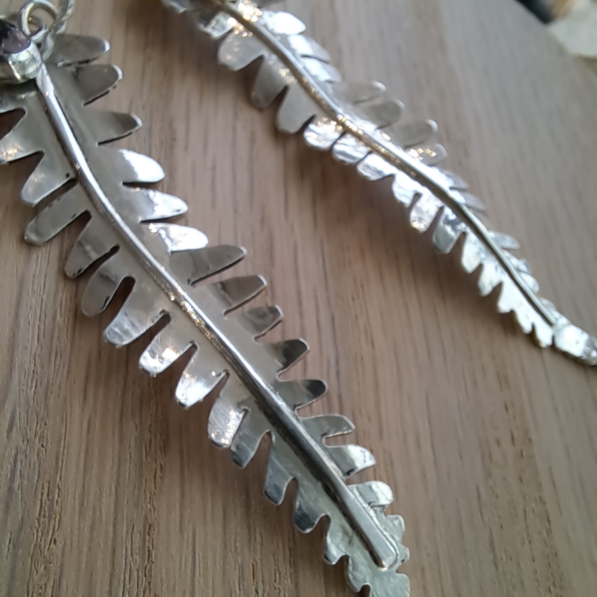 Sterling silver long drop earrings, hand pierced and formed as fern leaves. Adorned with checker cut cabochon amethyst stones. Approx drop 7-8cm