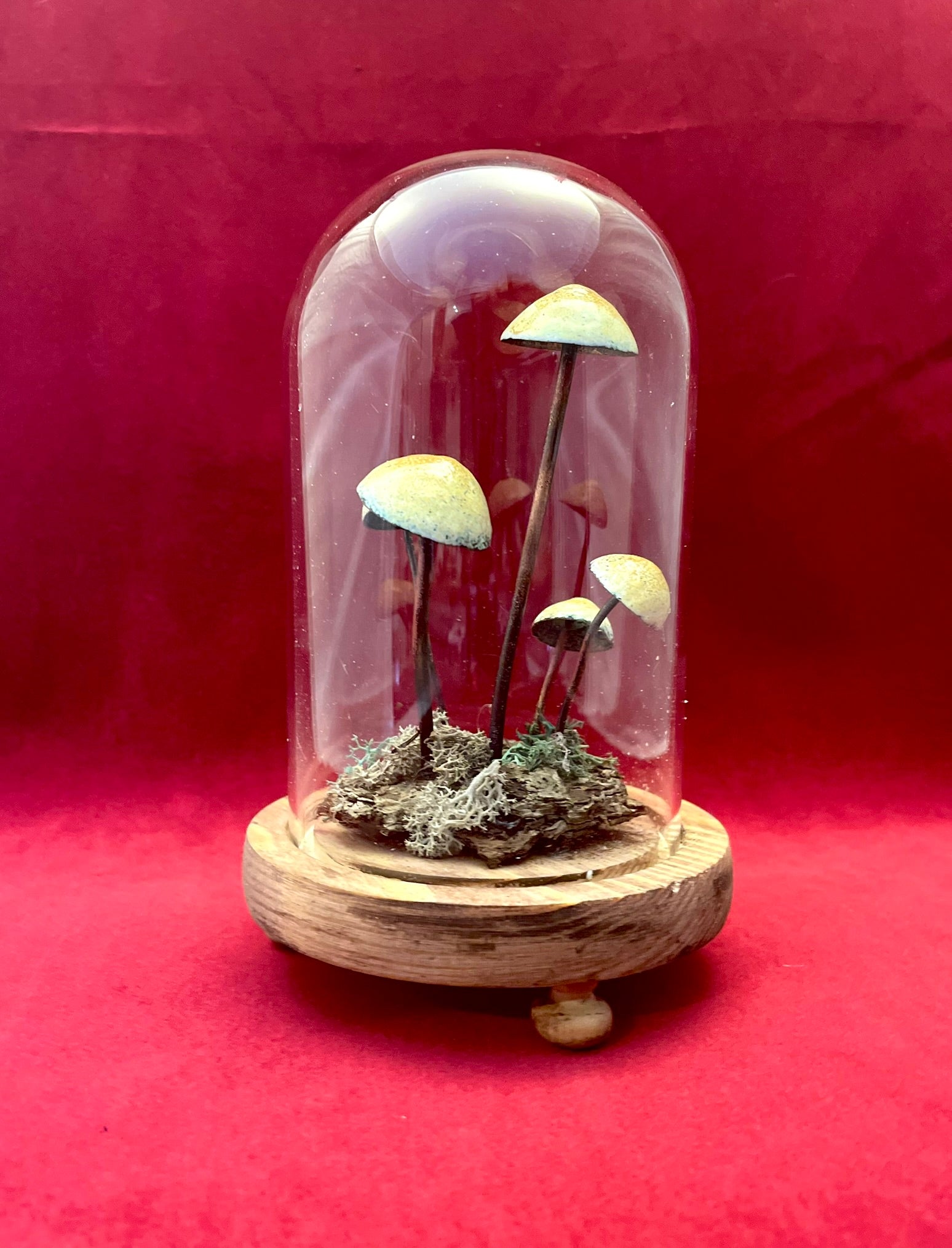 Glass cloche containing a display of vitreous enamelled toadstools.