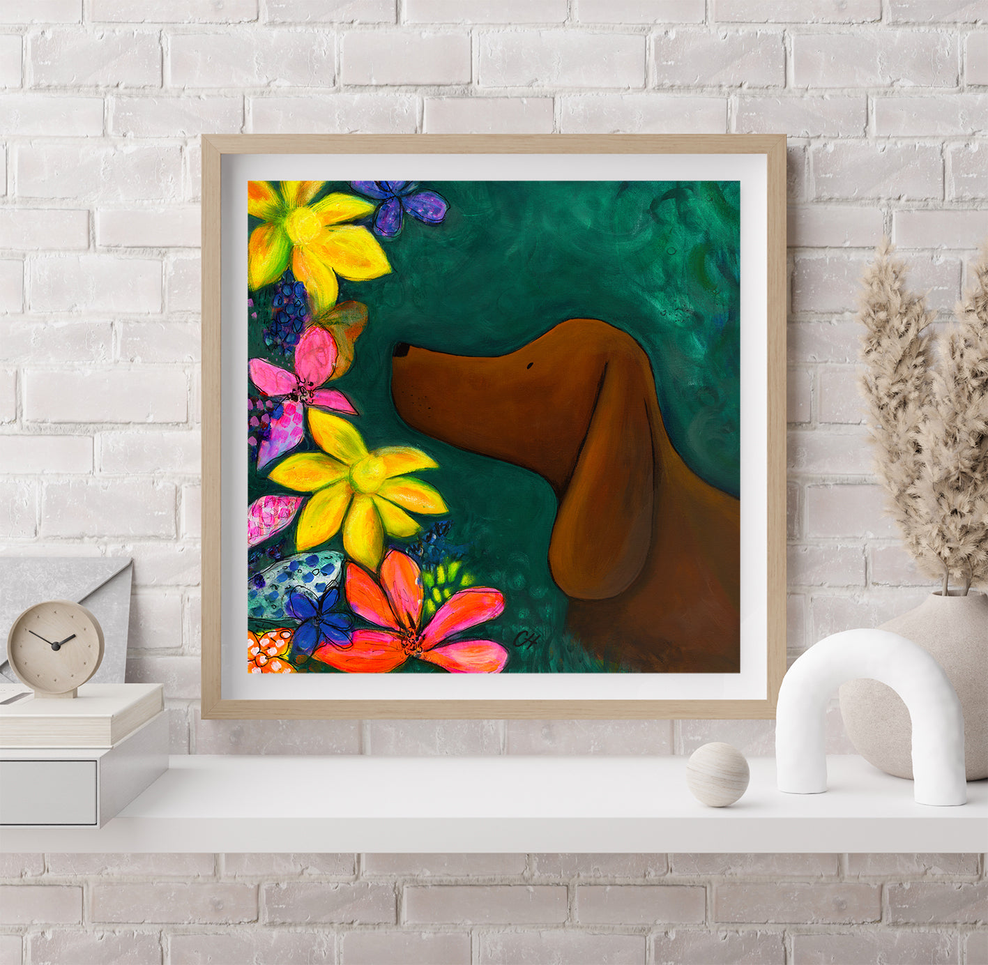 This is part of Christine's 'Sketchy Dog' series and features a cute Daschund looking into the flowers with an emerald green textured background and bright neons.