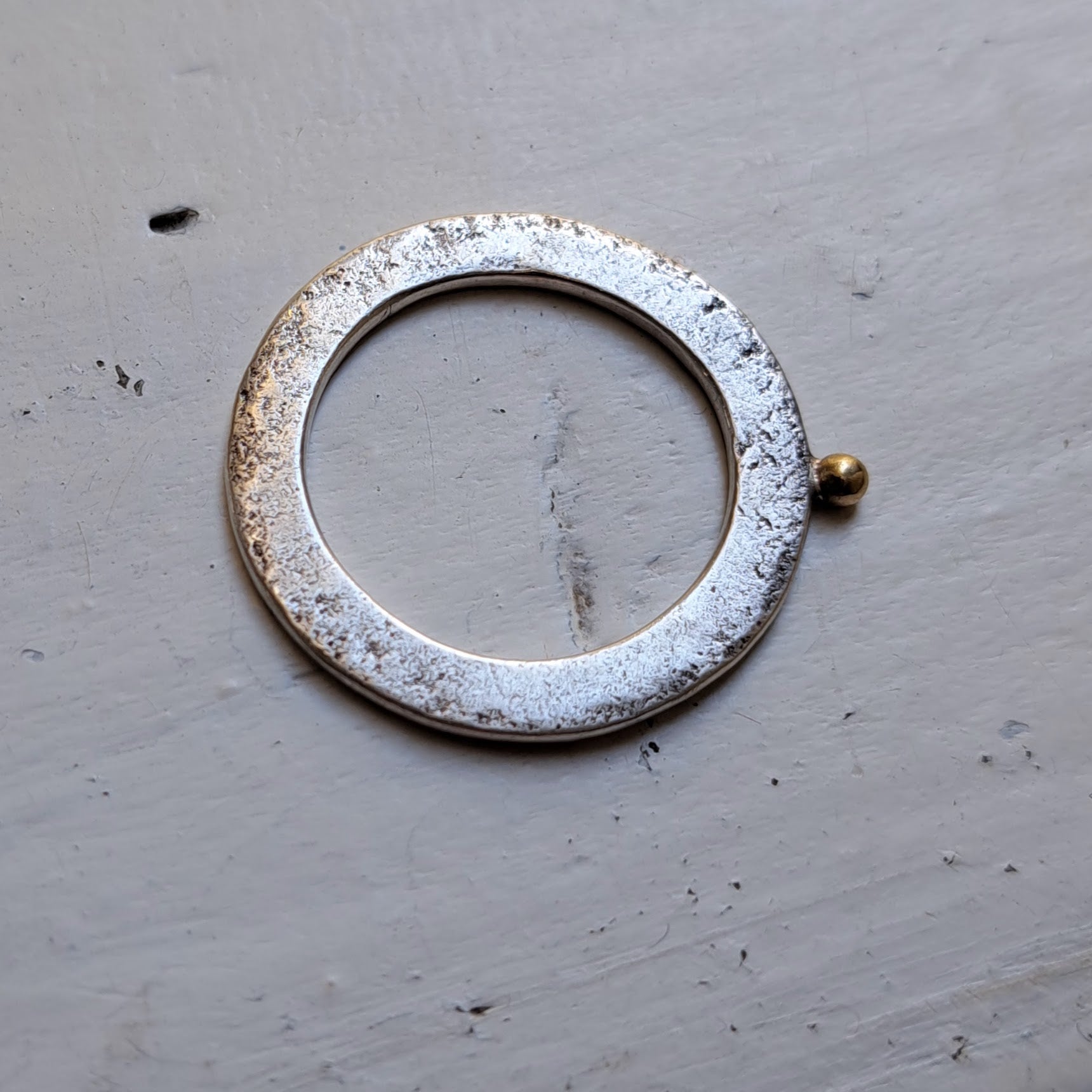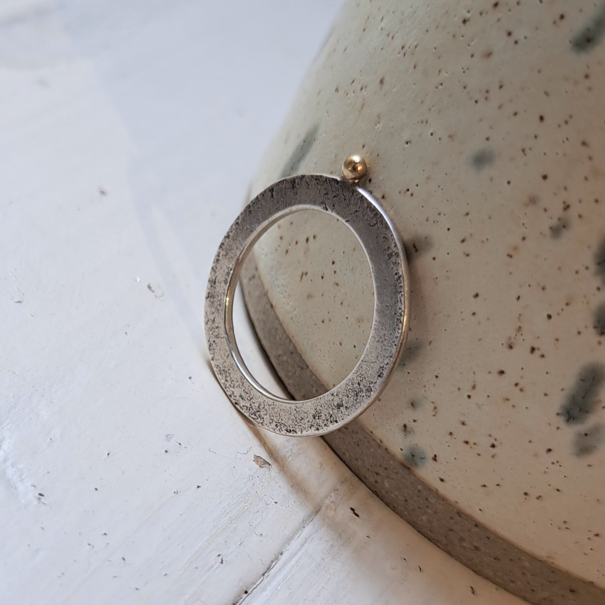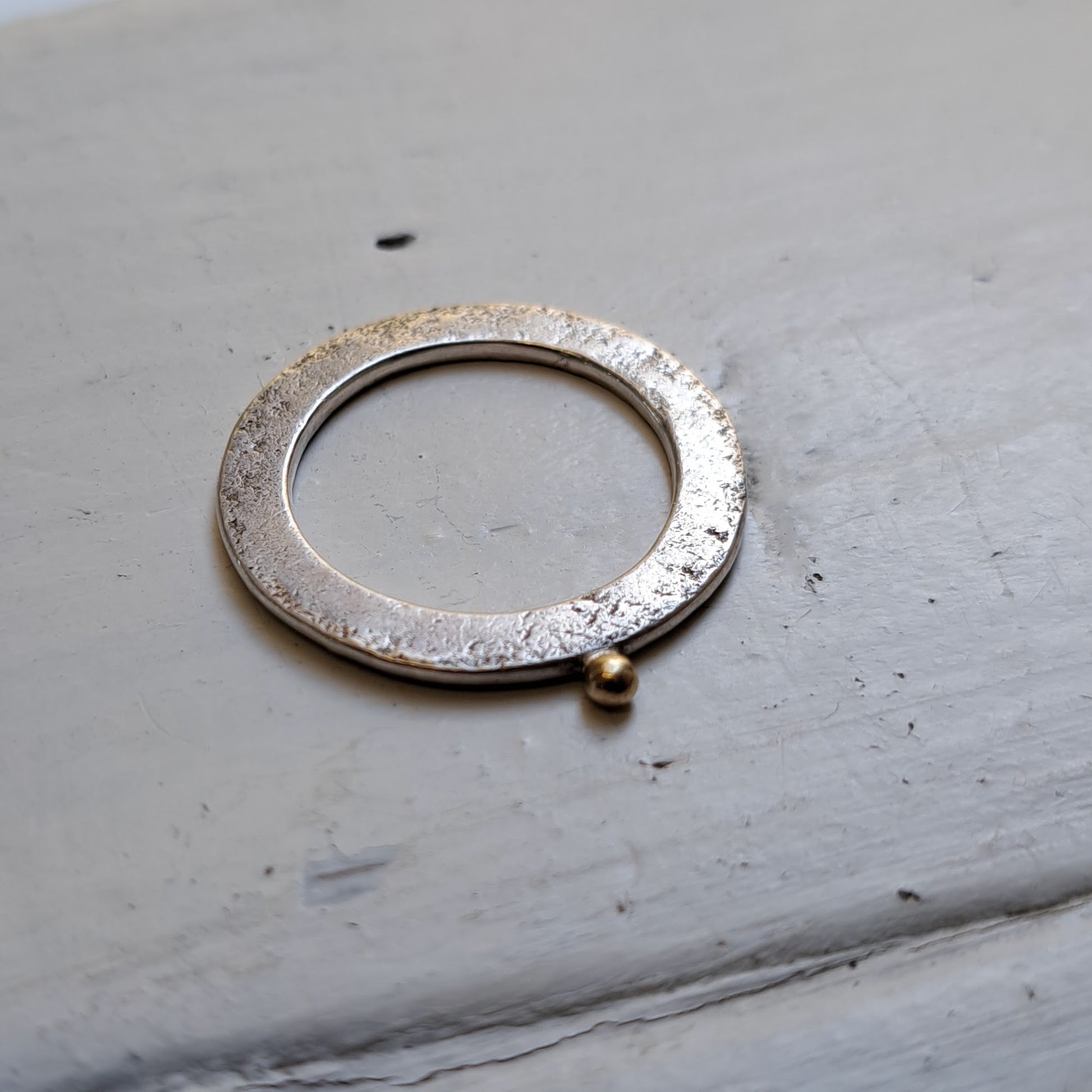 Recycled sterling silver hand forged washer style ring, hand textured with a stone hammer and finished with a 9k gold bead
