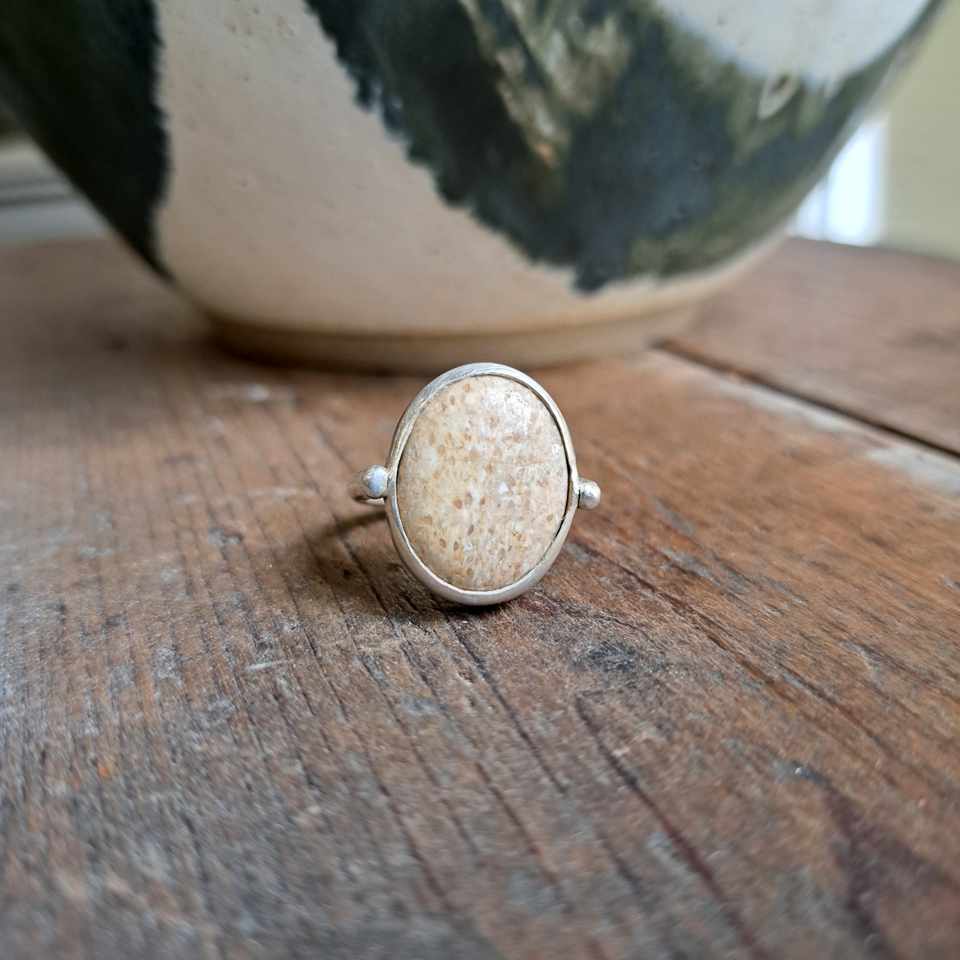 Sterling silver ring, created in a stirrup shape with a bezel set cream beach pebble approx pebble size 1 x 1.5cm
