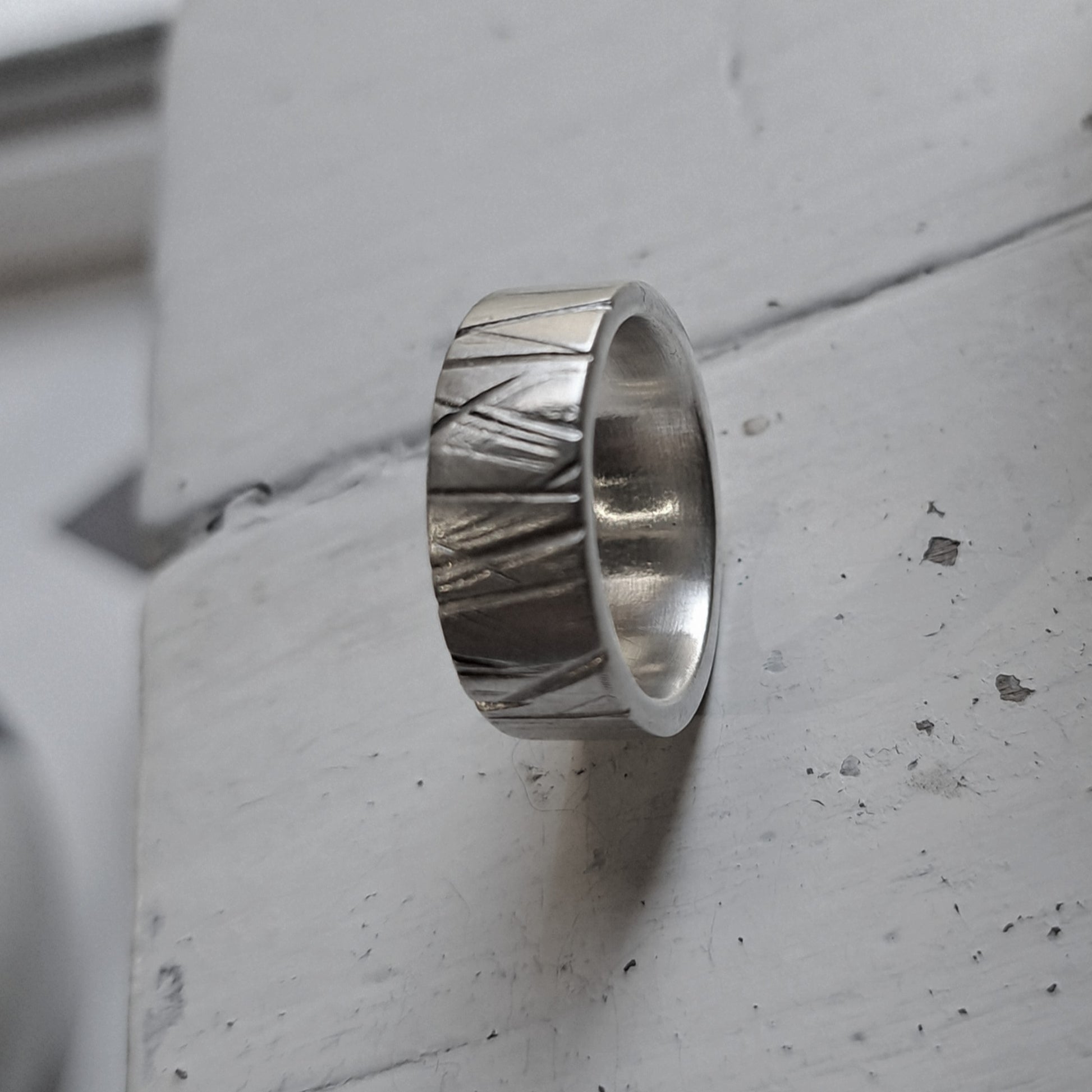 Sterling silver heavy flat band ring, finished with driftwood texture and a satin polish.
