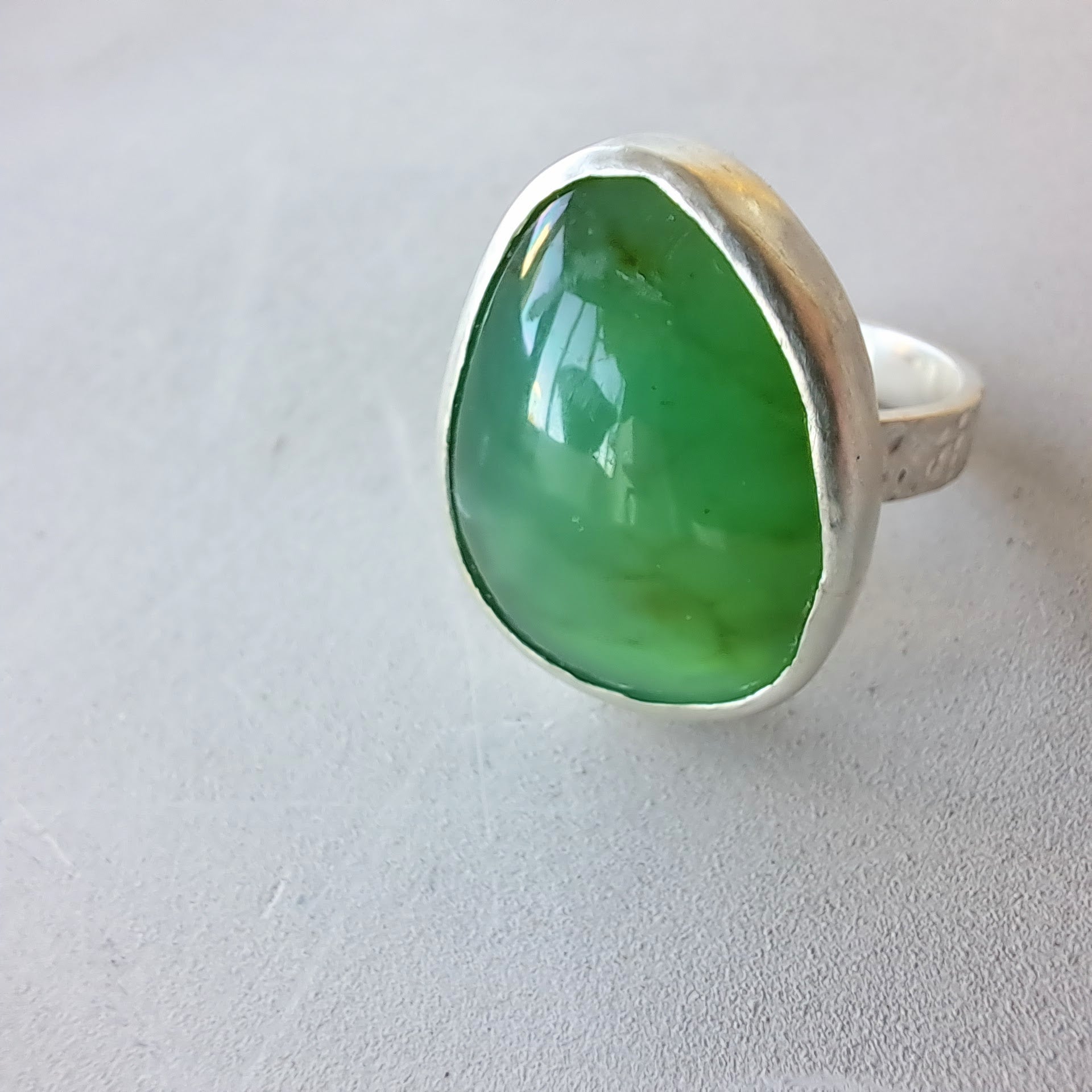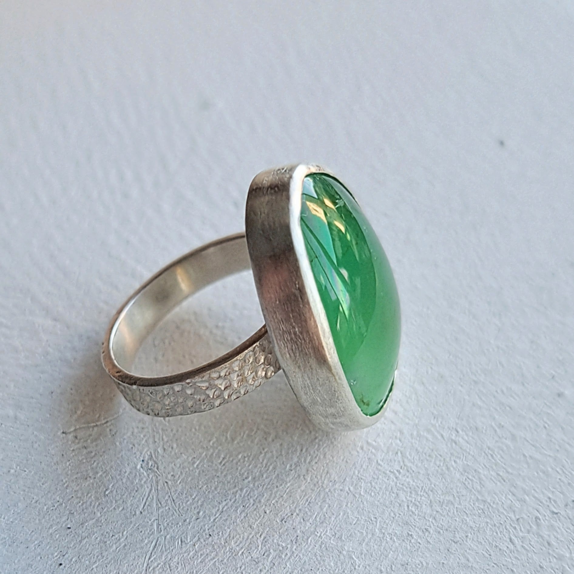 Sterling silver narrow bur-textured band ring, adorned with a bezel set freeform glowing green chrysoprase cabochon. Chrysoprase is a type of chalcedony, beautiful and semi transparent with hidden depth.