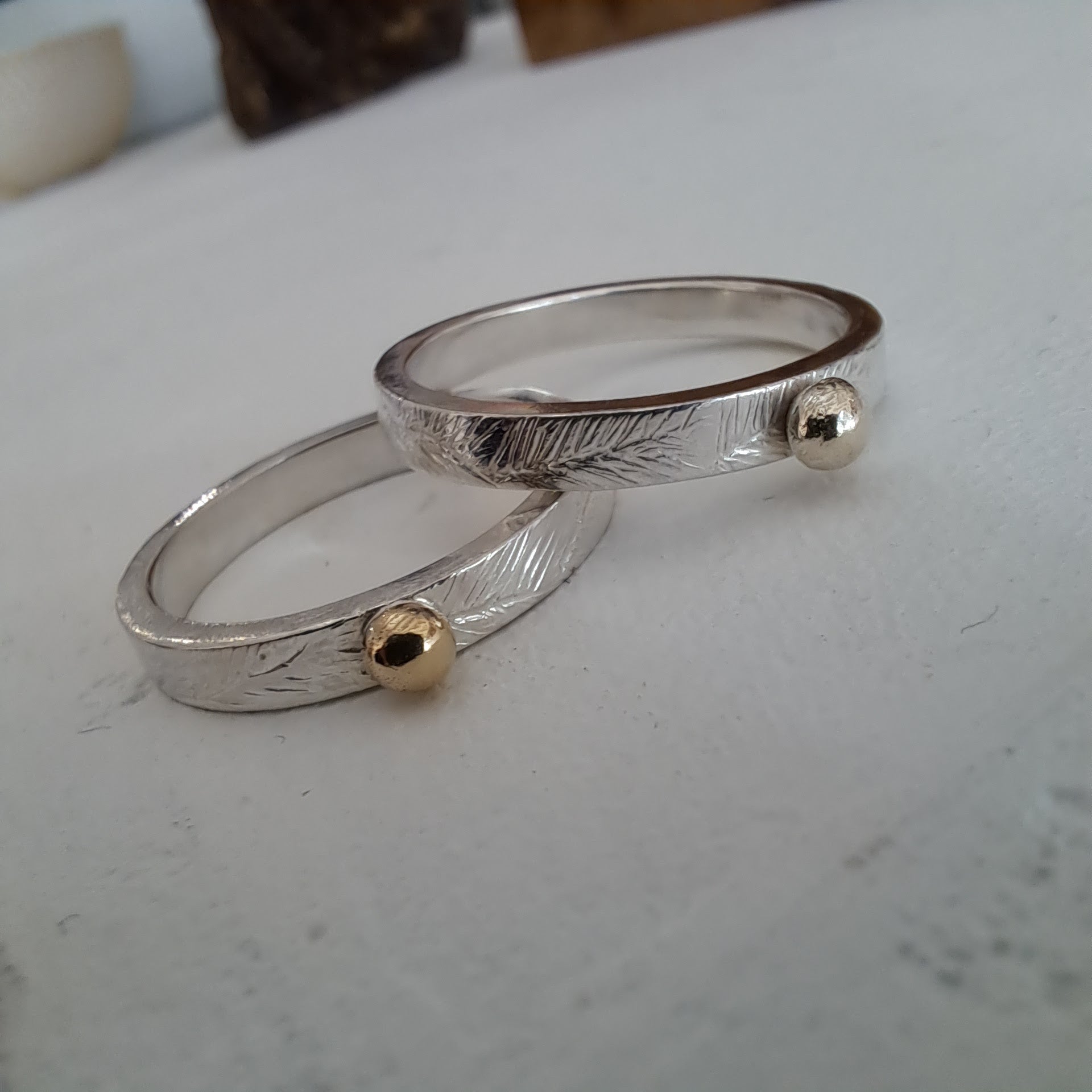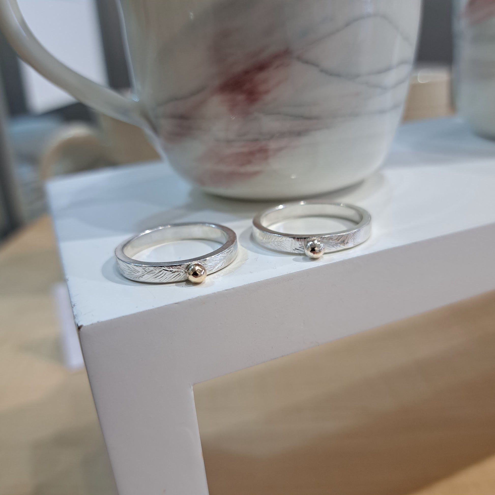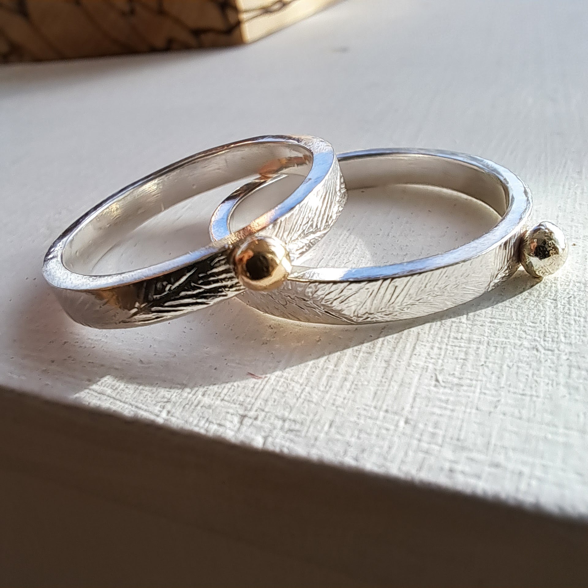 Recycled sterling silver and 9k gold granule band rings, hand textured with seagrass design