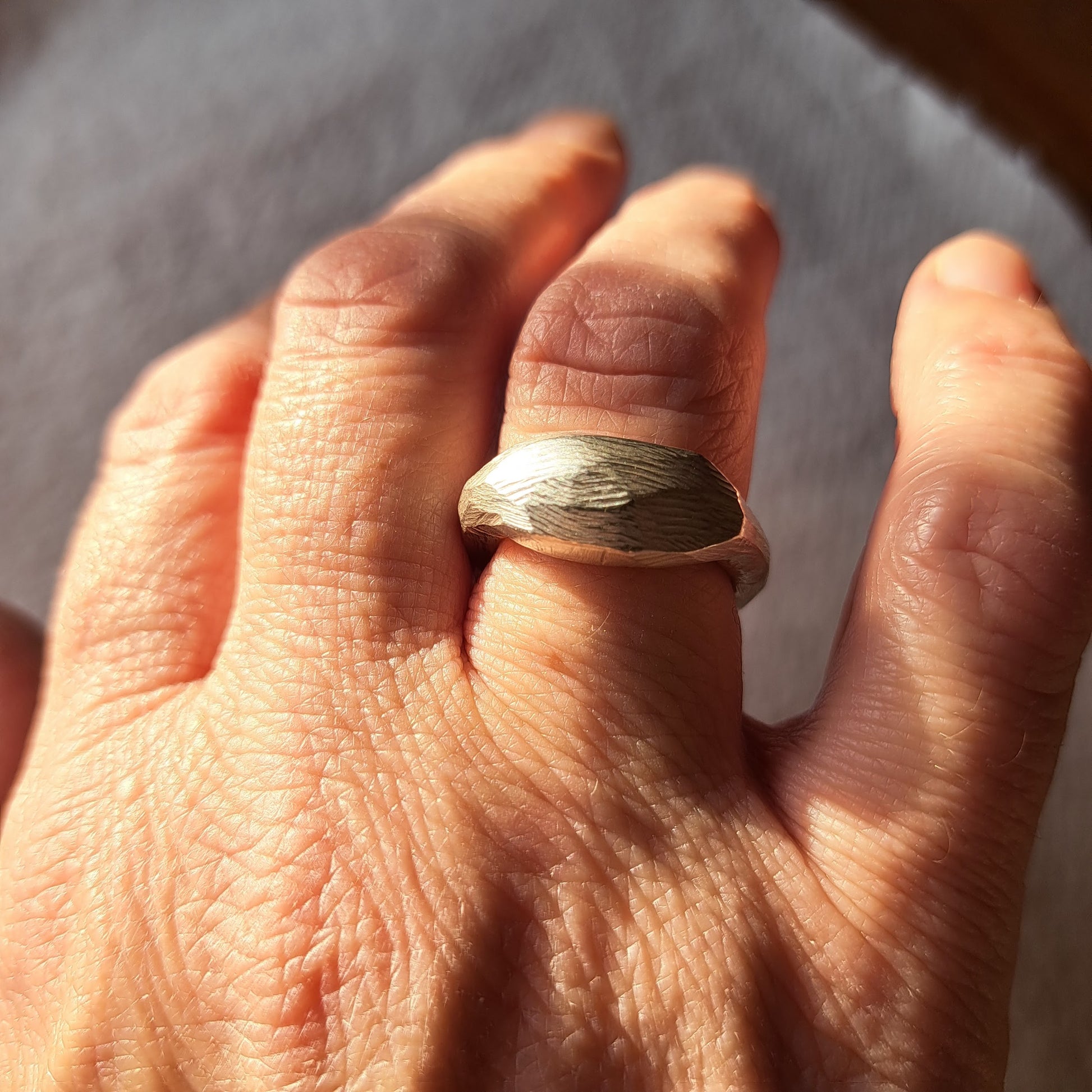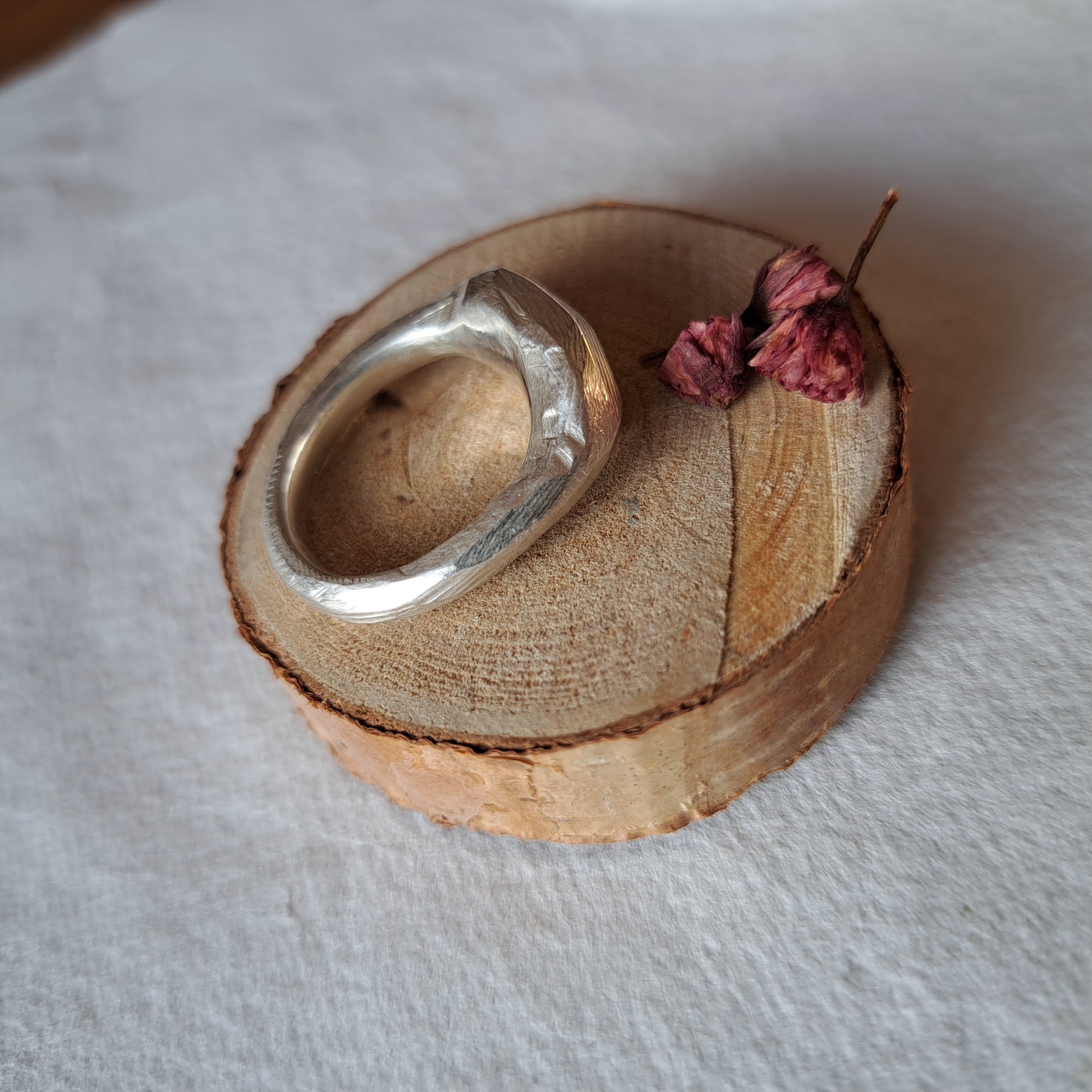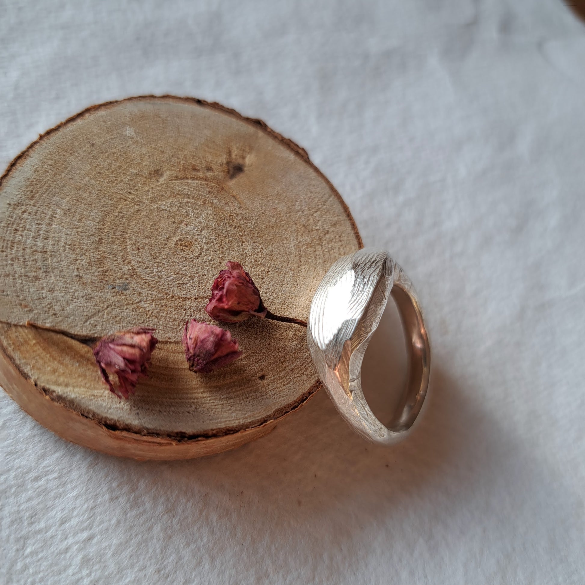 Sterling silver cast ring, created using the ancient lost wax method, heavyweight and chunky and textured using antique tools.