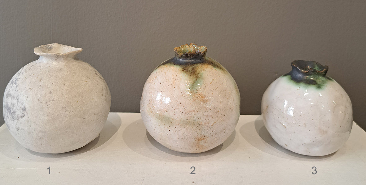 A selection of mini moon jars, textured and glazed, exhibit as a mini collection on a windowsill, each piece is unique. Hand made in Filey, North Yorkshire.