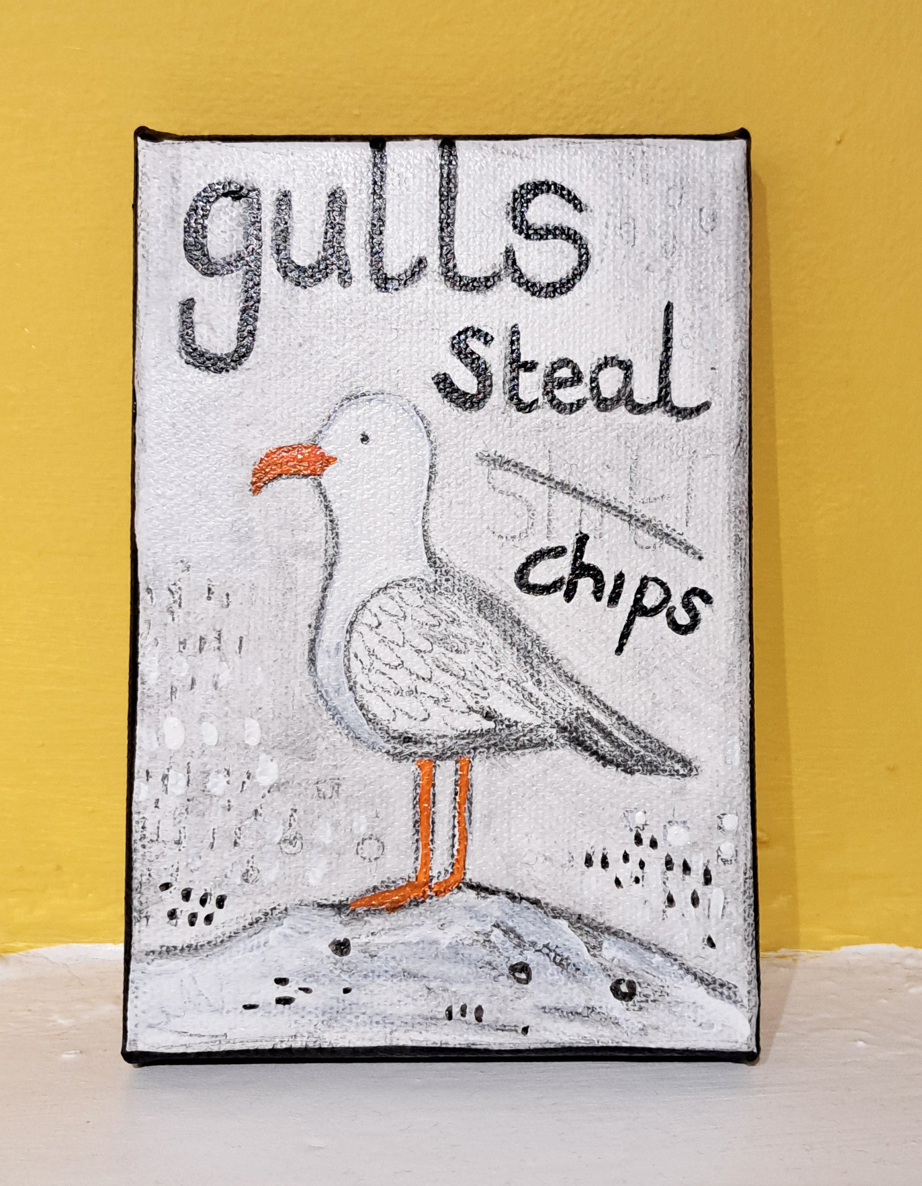Gulls steal sh**t!! and chips! a mini acrylic on canvas illustration, with mini easel. or can be hung from back.