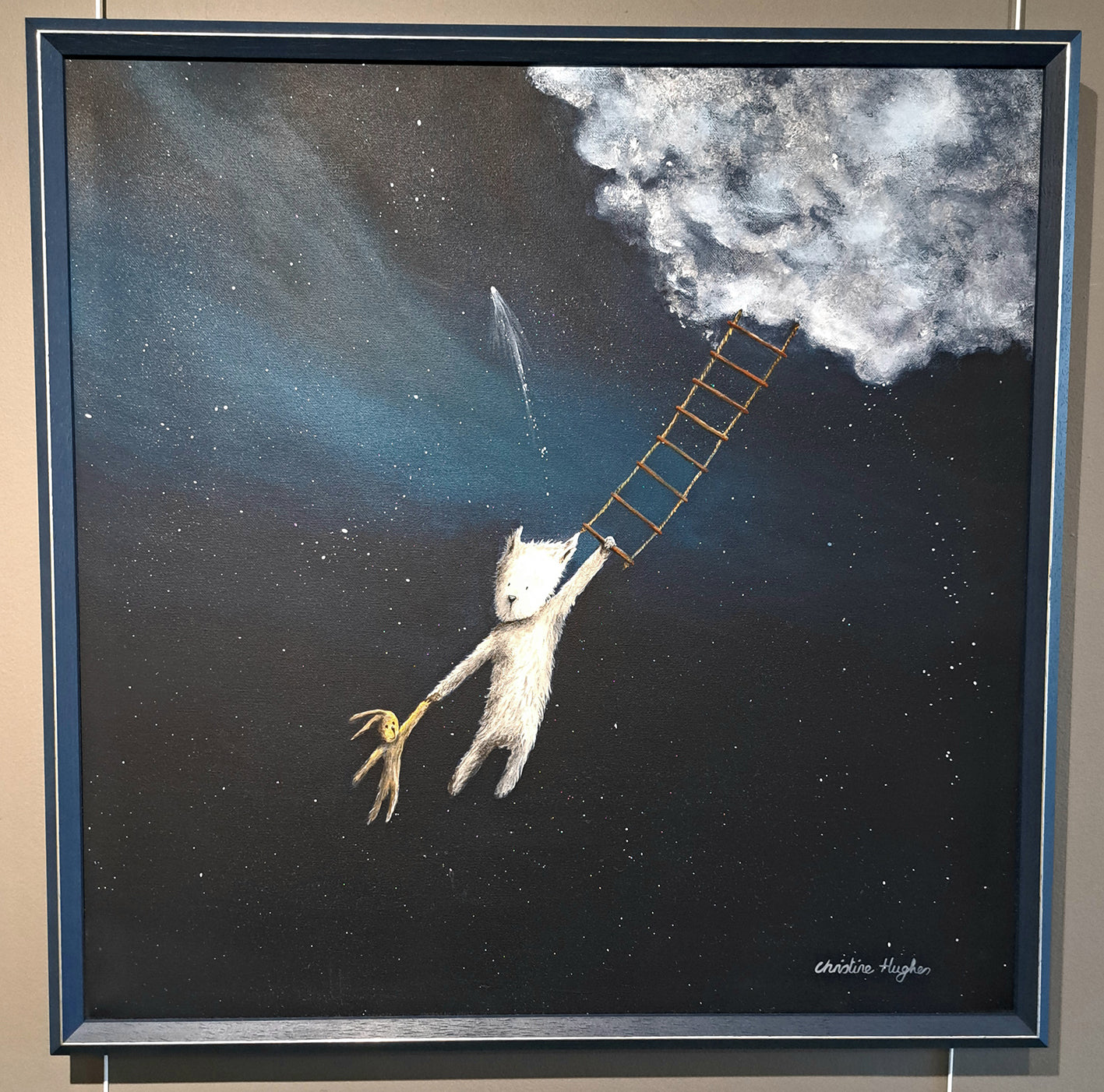 Part of Christine's 'Enchanted Collection'. The Westie terrier dog is holding on to his friend the rabbit teddy, floating in the clouds gripping onto the rope ladder. Thoughts of holding onto love, cherished things and every cloud has a silver lining, we all have something or someone we need to hold on to.