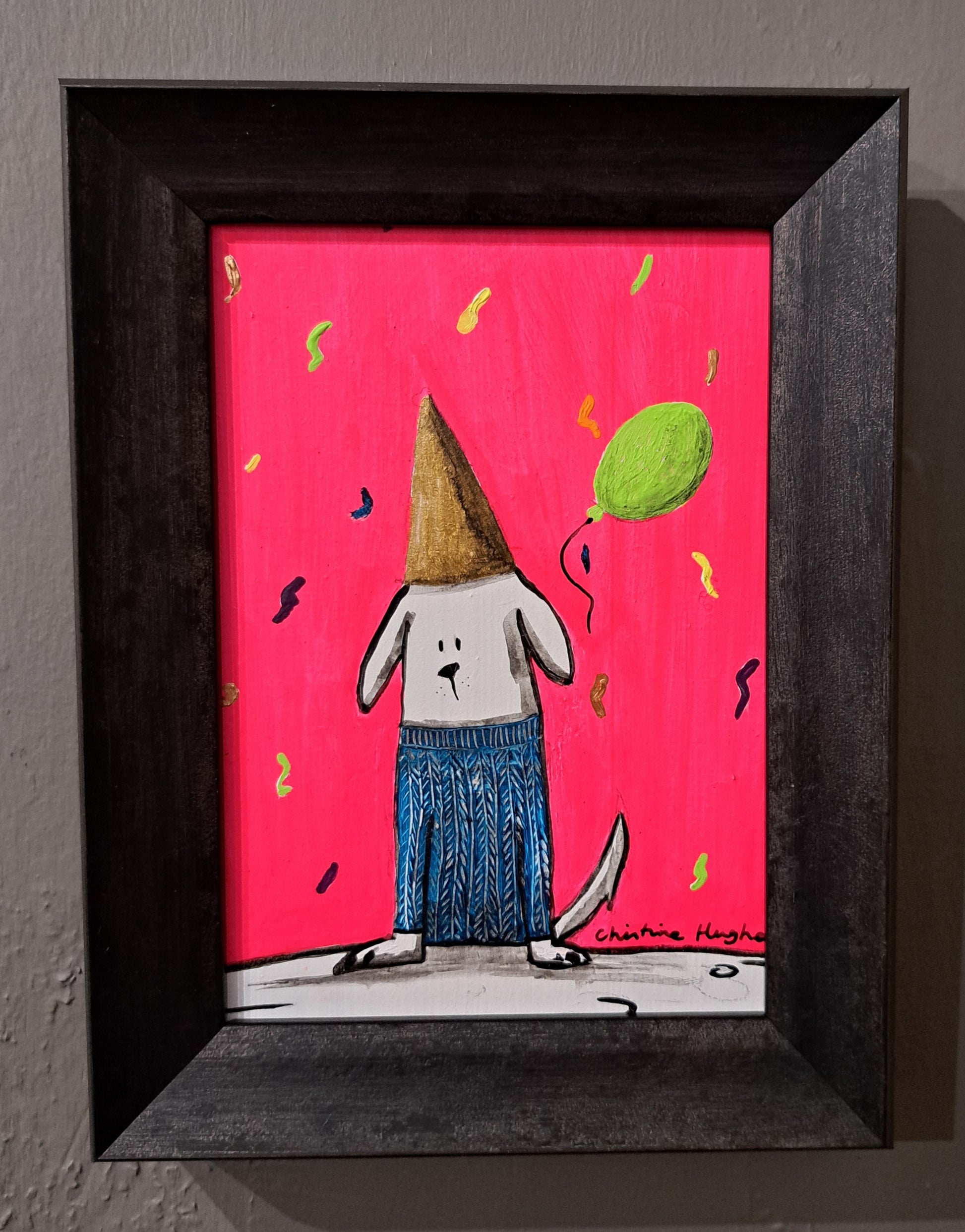 A perfect mini dog illustration with bright neon background 'Party Time' is an original acrylic painting on board. Framed in a colusseum charcoal angled frame.