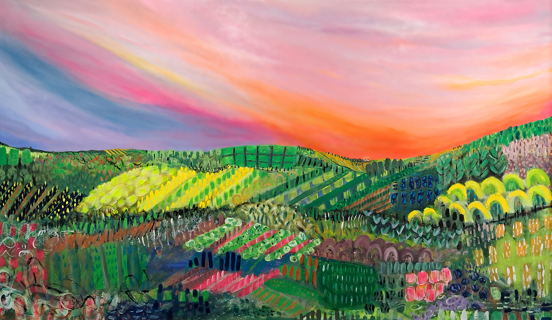 Sunset Symphony an imagined landscape inspired by the North Yorkshire Moors with a patchwork of brightly coloured fields in neon with highlights of bright yellow. With a bright neon pink and orange sunset in a painterly style.