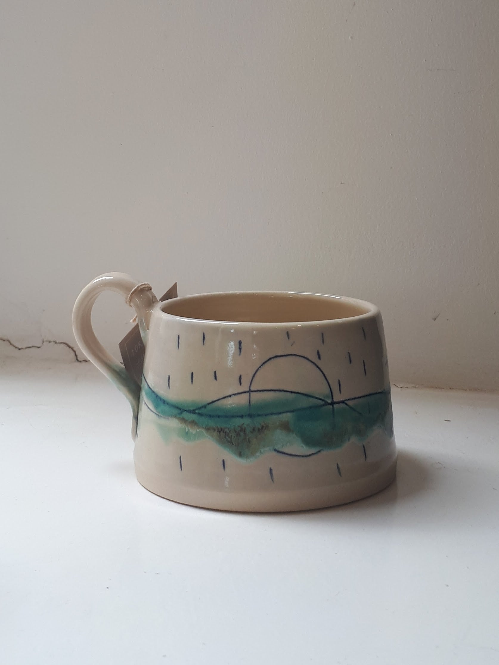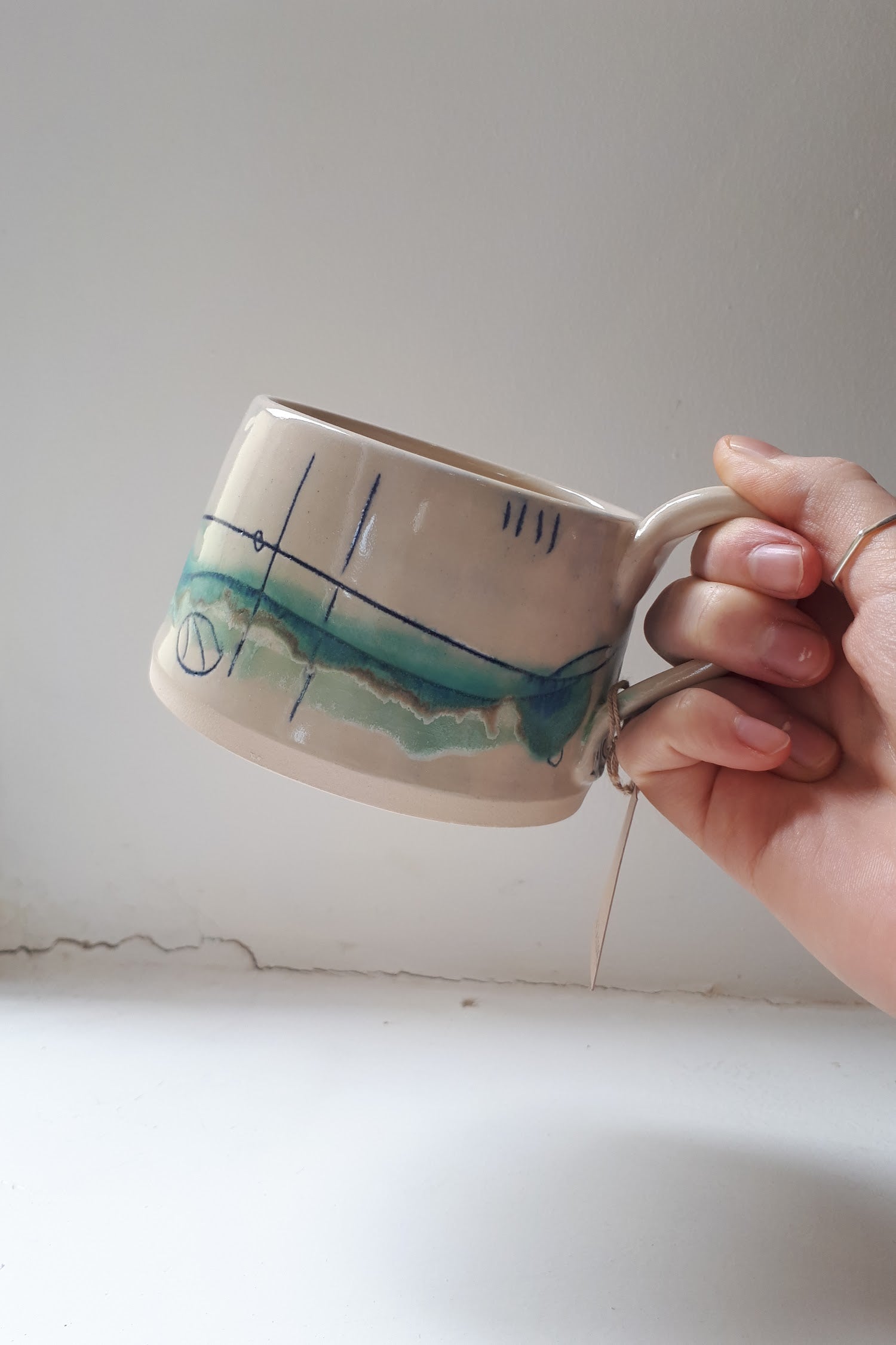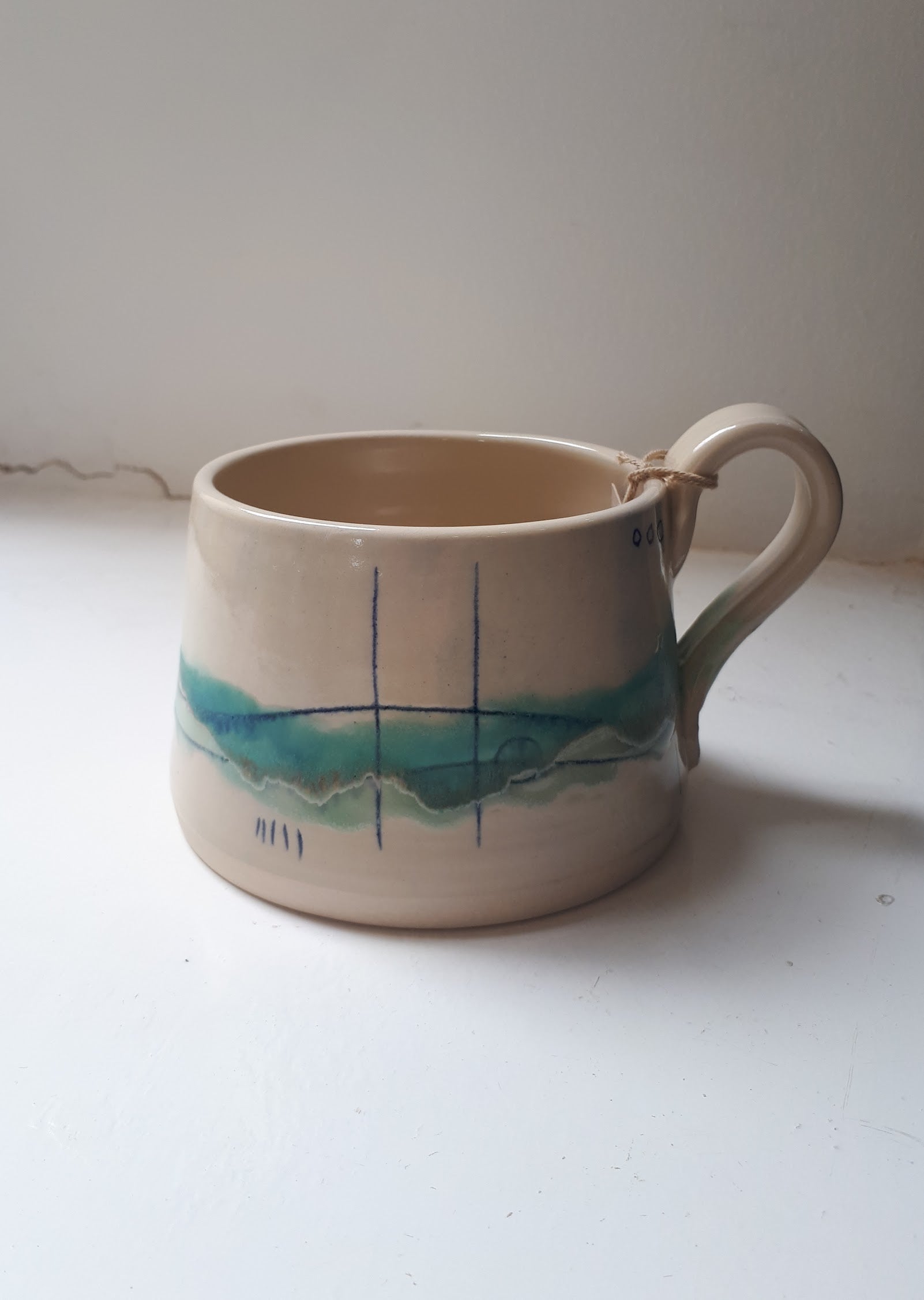 Hand thrown by Lorna in her Yorkshire garden studio, these white stoneware cups have been made using as few resources as possible. Decorated with a mix of green and turquoise glazes, each has a simple undulating design that reflects the pattern of the ocean and the sea shore. Part of the Seascape collection of pieces, all unique.