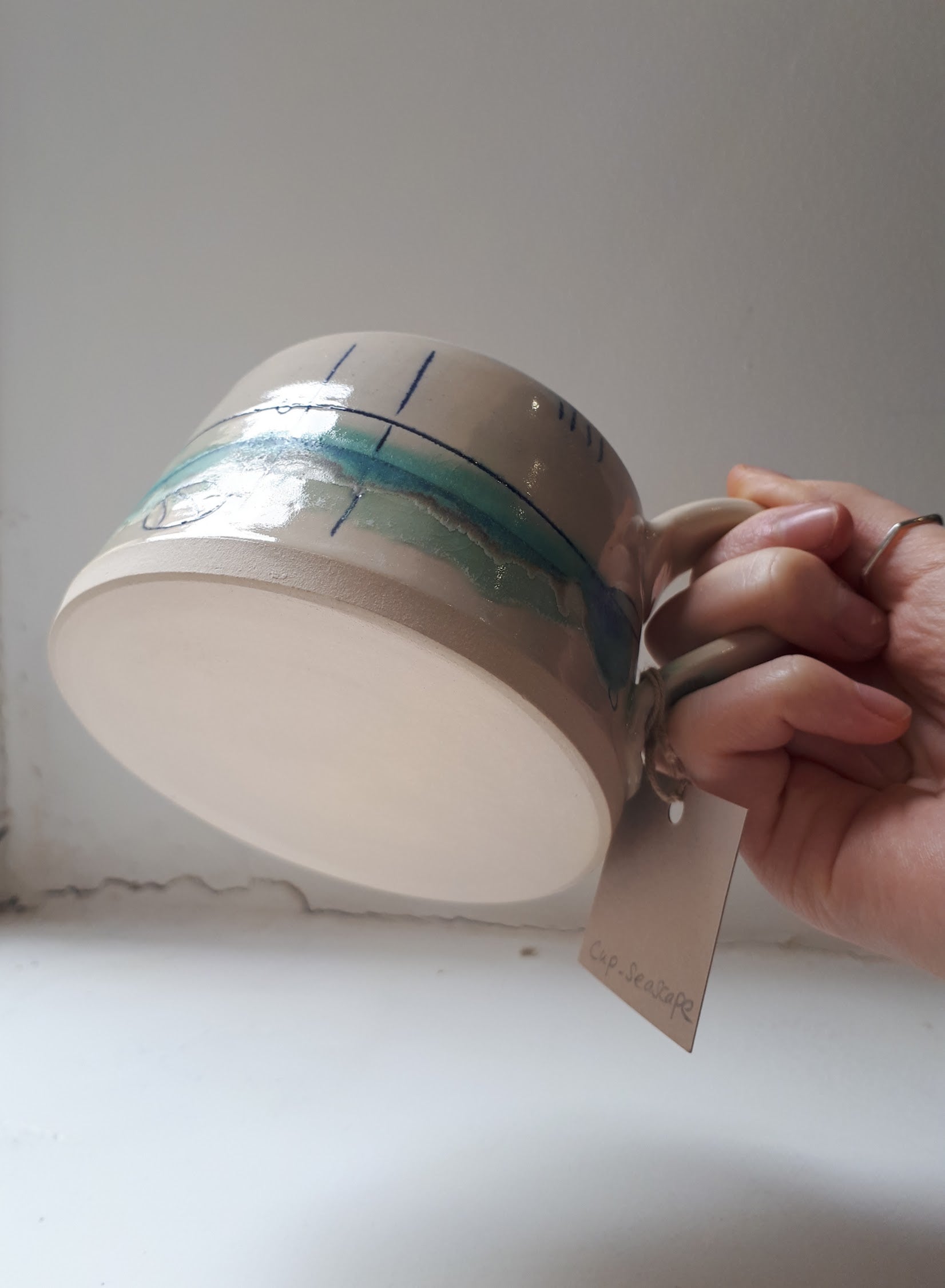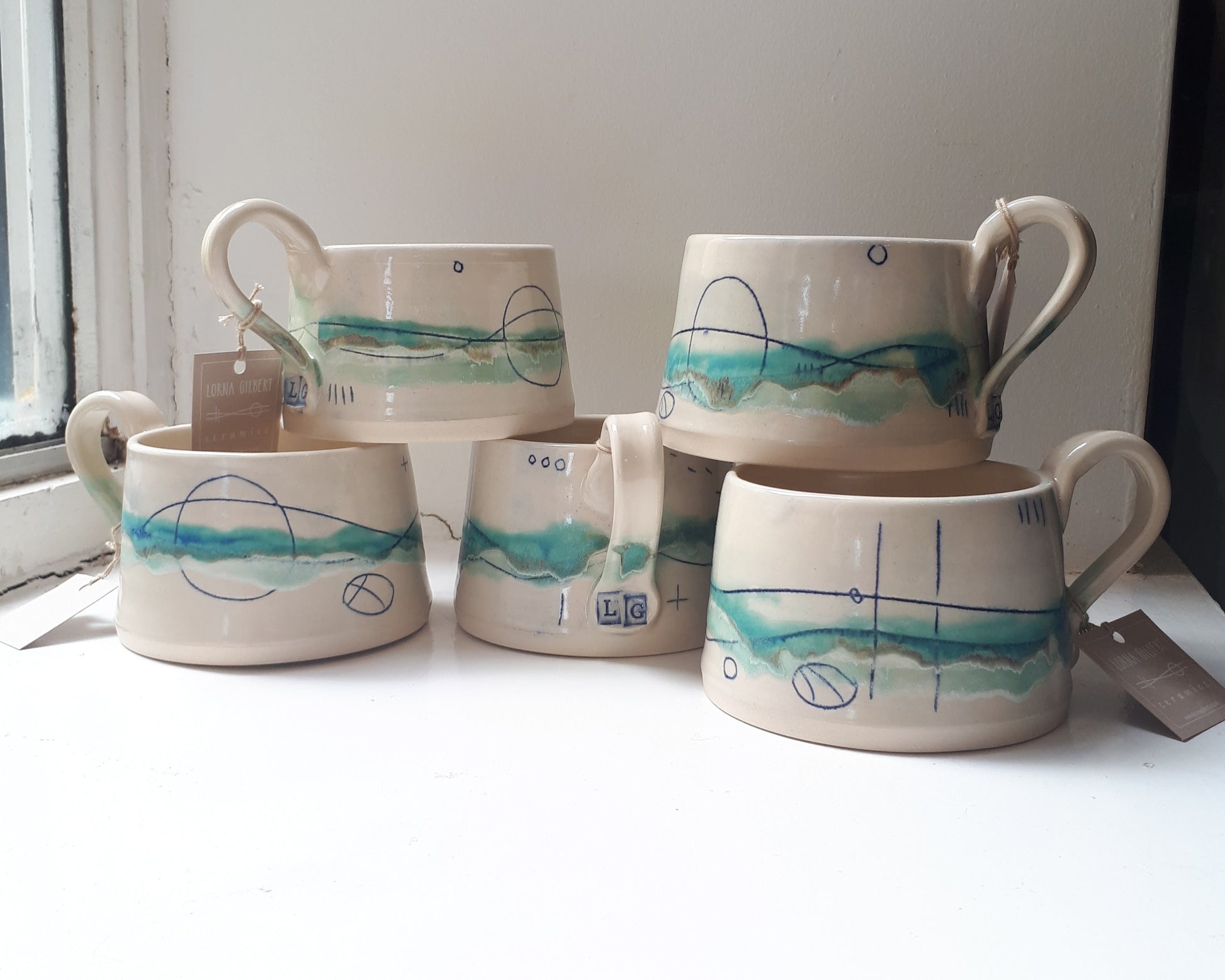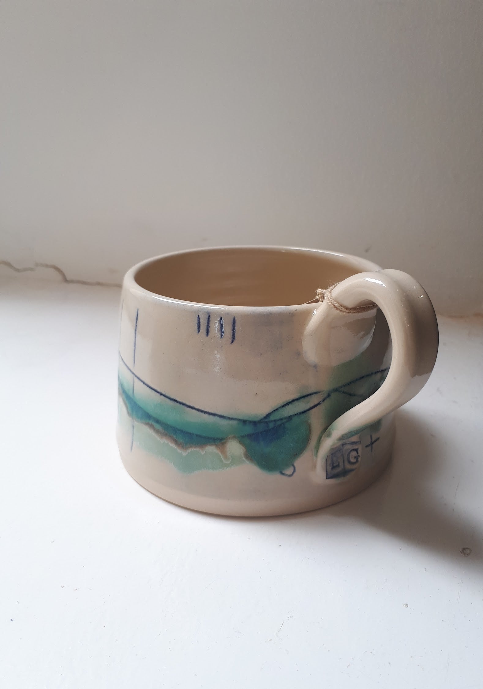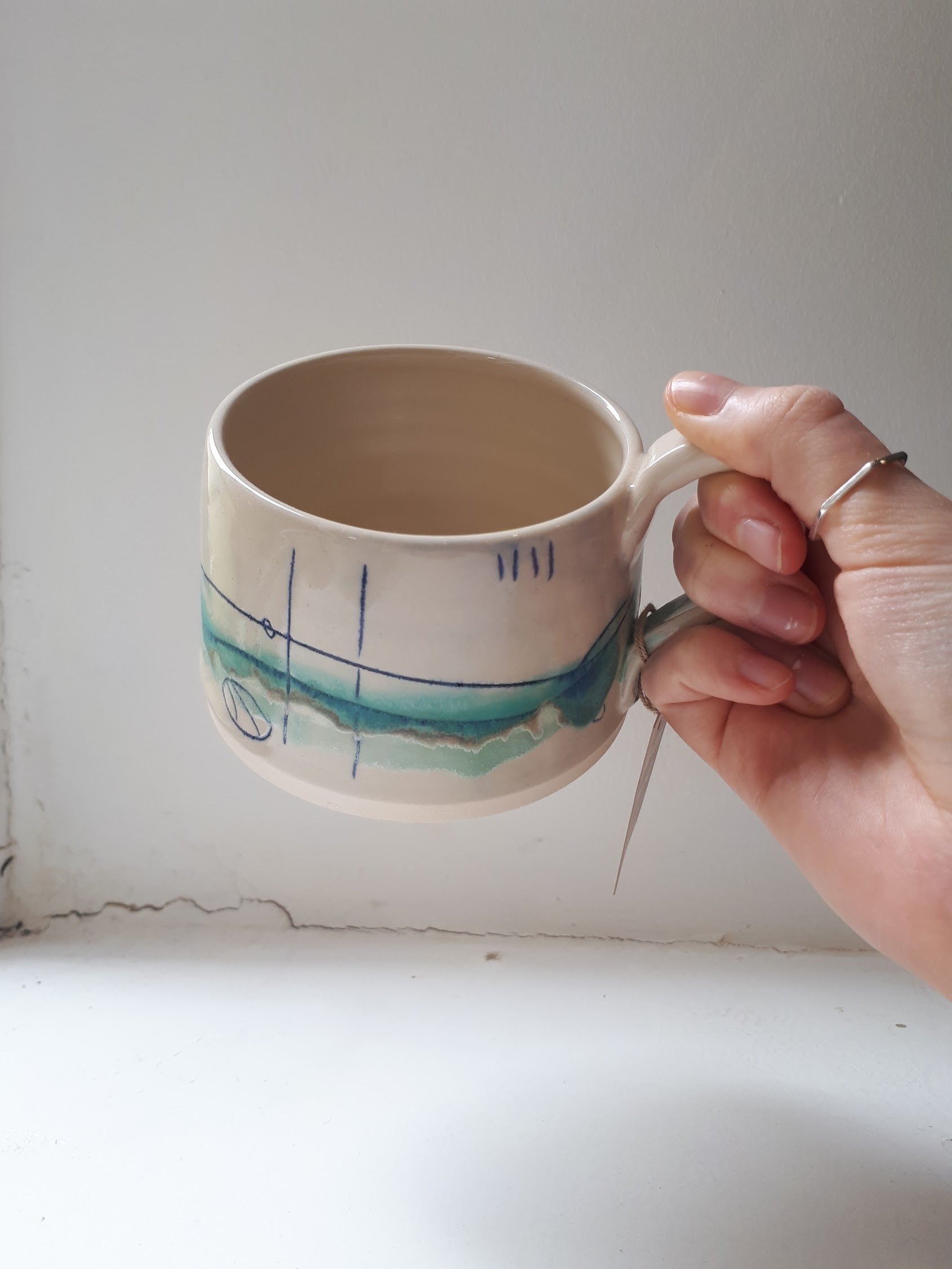 Hand thrown by Lorna in her Yorkshire garden studio, these white stoneware cups have been made using as few resources as possible. Decorated with a mix of green and turquoise glazes, each has a simple undulating design that reflects the pattern of the ocean and the sea shore. Part of the Seascape collection of pieces, all unique.