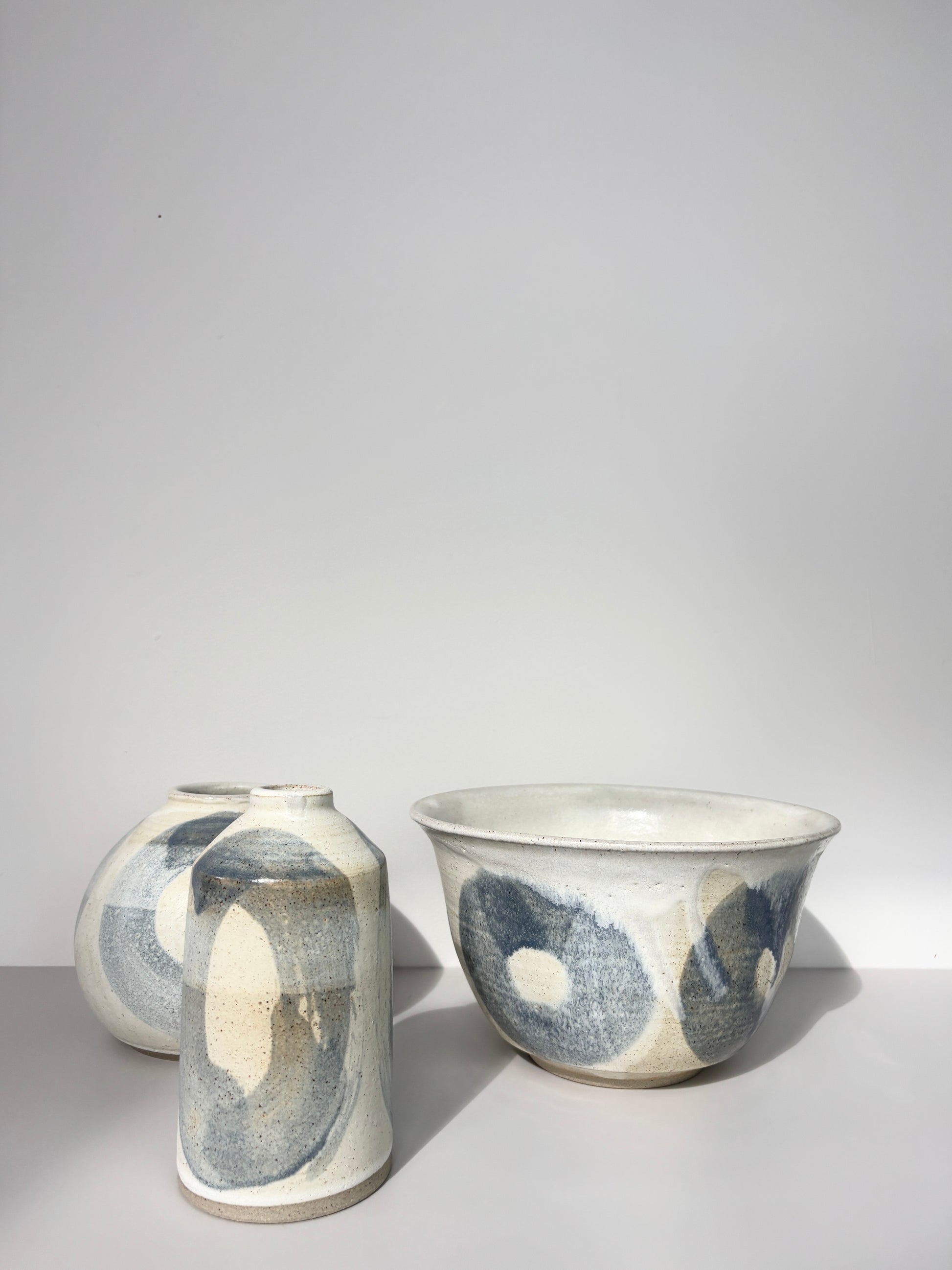 Danielle has created a collection featuring a gloss pale blue glaze layered over a matte off-white base. This work is inspired by a weekend spent in the beautiful village of Alnmouth, with its long, stretching beach that gently curves around the picturesque village. The serene coastal landscape and calming colours of Alnmouth are reflected in this collection.