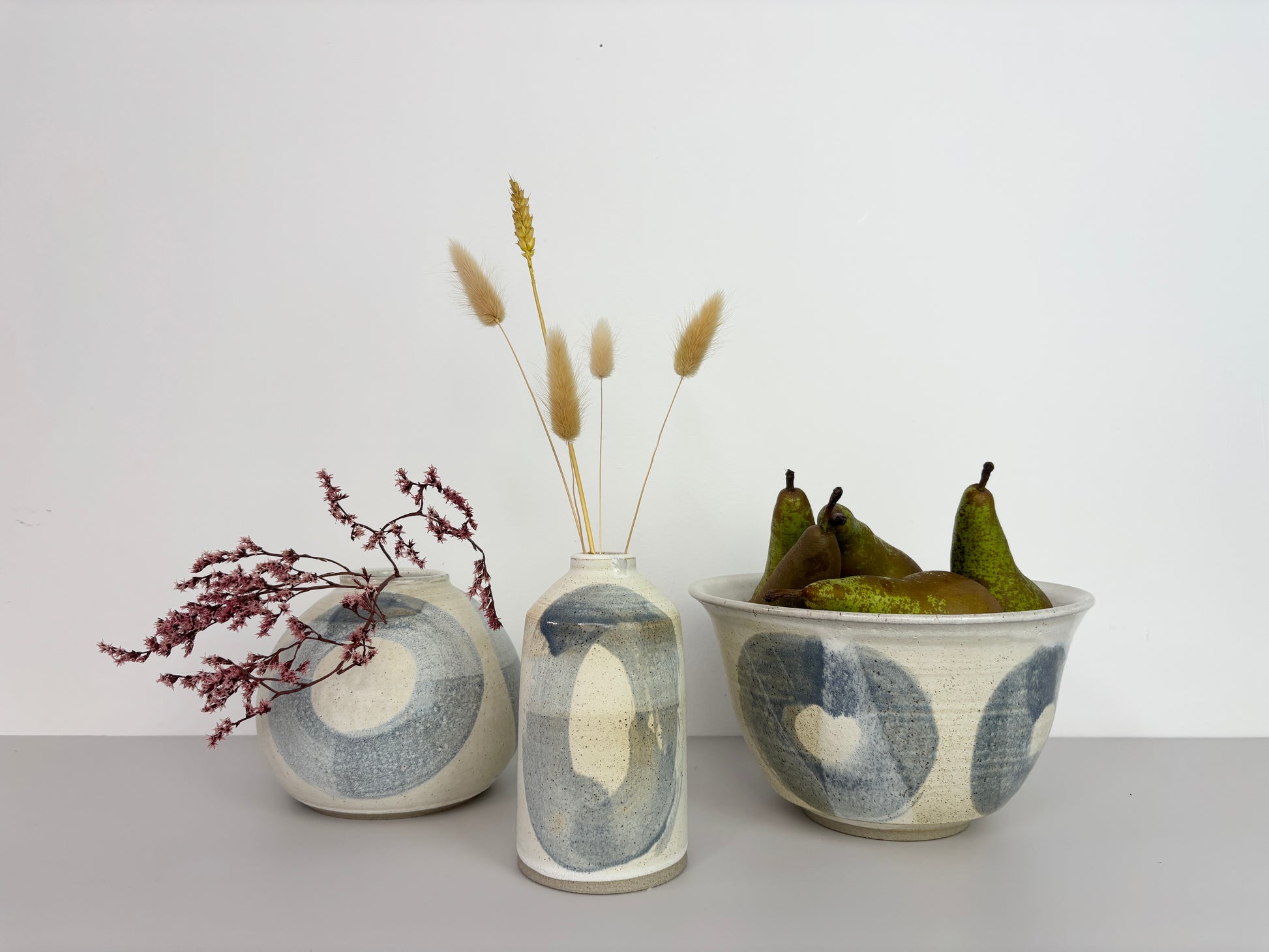 Danielle has created a collection featuring a gloss pale blue glaze layered over a matte off-white base. This work is inspired by a weekend spent in the beautiful village of Alnmouth, with its long, stretching beach that gently curves around the picturesque village. The serene coastal landscape and calming colours of Alnmouth are reflected in this collection.