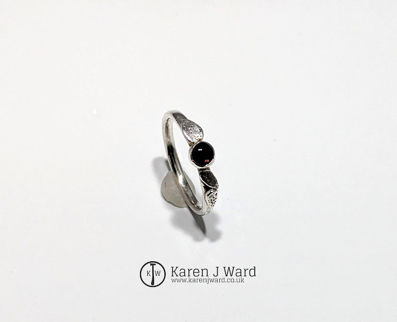 Sterling silver ring featuring hand carved leaves, either side of a round bezel set garnet cabochon. Finished with a beautiful polish. Handcrafted by Karen in her home studio in the Yorkshire countryside.