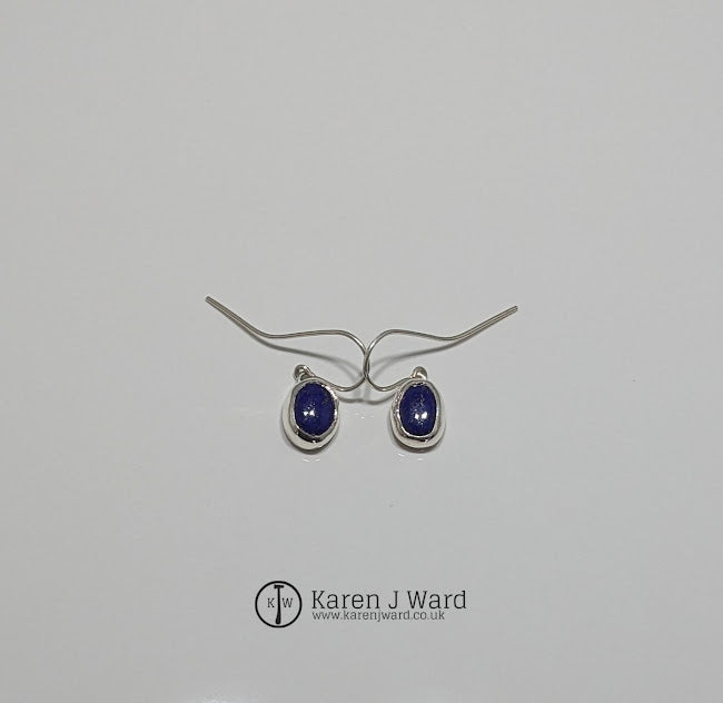 Sterling silver drop earrings simply and beautifully featuring oval lapis lazuli bezel set cabochons, and finished with a high polish. Handcrafted by Karen in her home studio in the Yorkshire countryside.