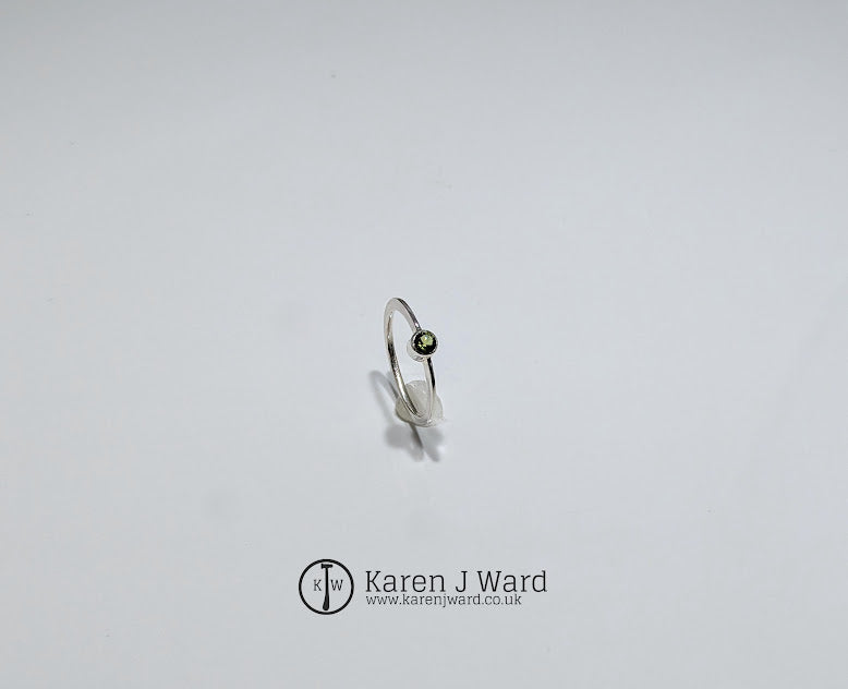Sterling silver slim ring simply and beautifully featuring a round bezel set peridot stone and finished with a high polish. Handcrafted by Karen in her home studio in the Yorkshire countryside.