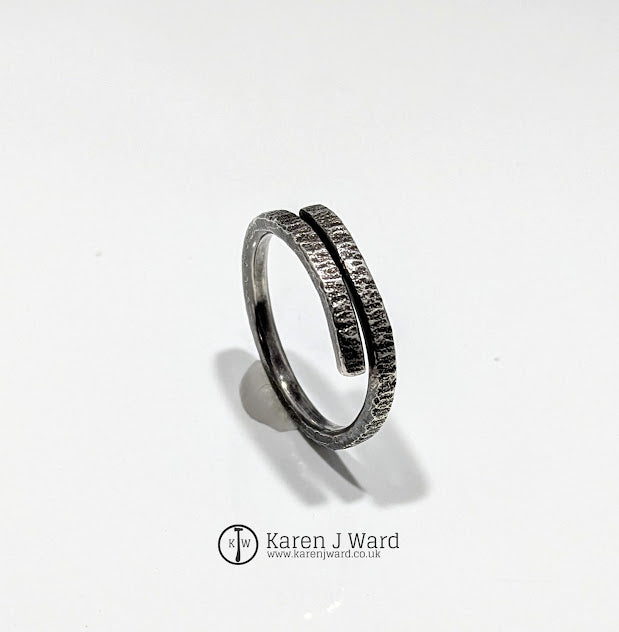 Sterling silver ring finished with a beautiful hammered bark texture before being oxidised. Handcrafted by Karen in her home studio in the Yorkshire countryside.