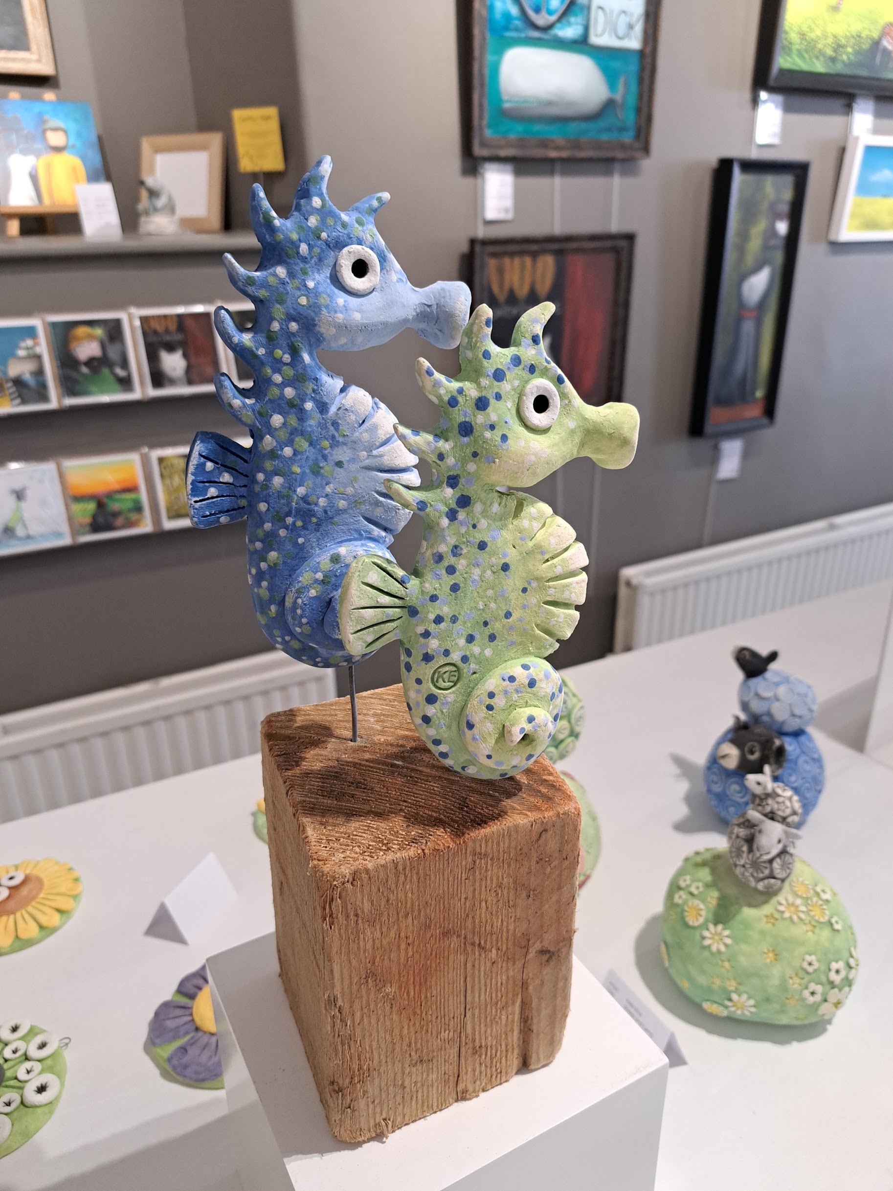 A pair of happy little green and blue seahorses made from glazed earthernware clay, mounted on a piece of reclaimed wood. The perfect piece to add to your coastal home interior.