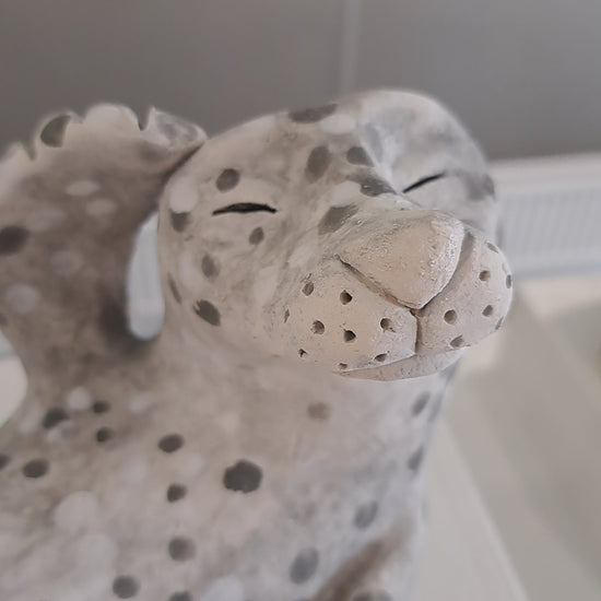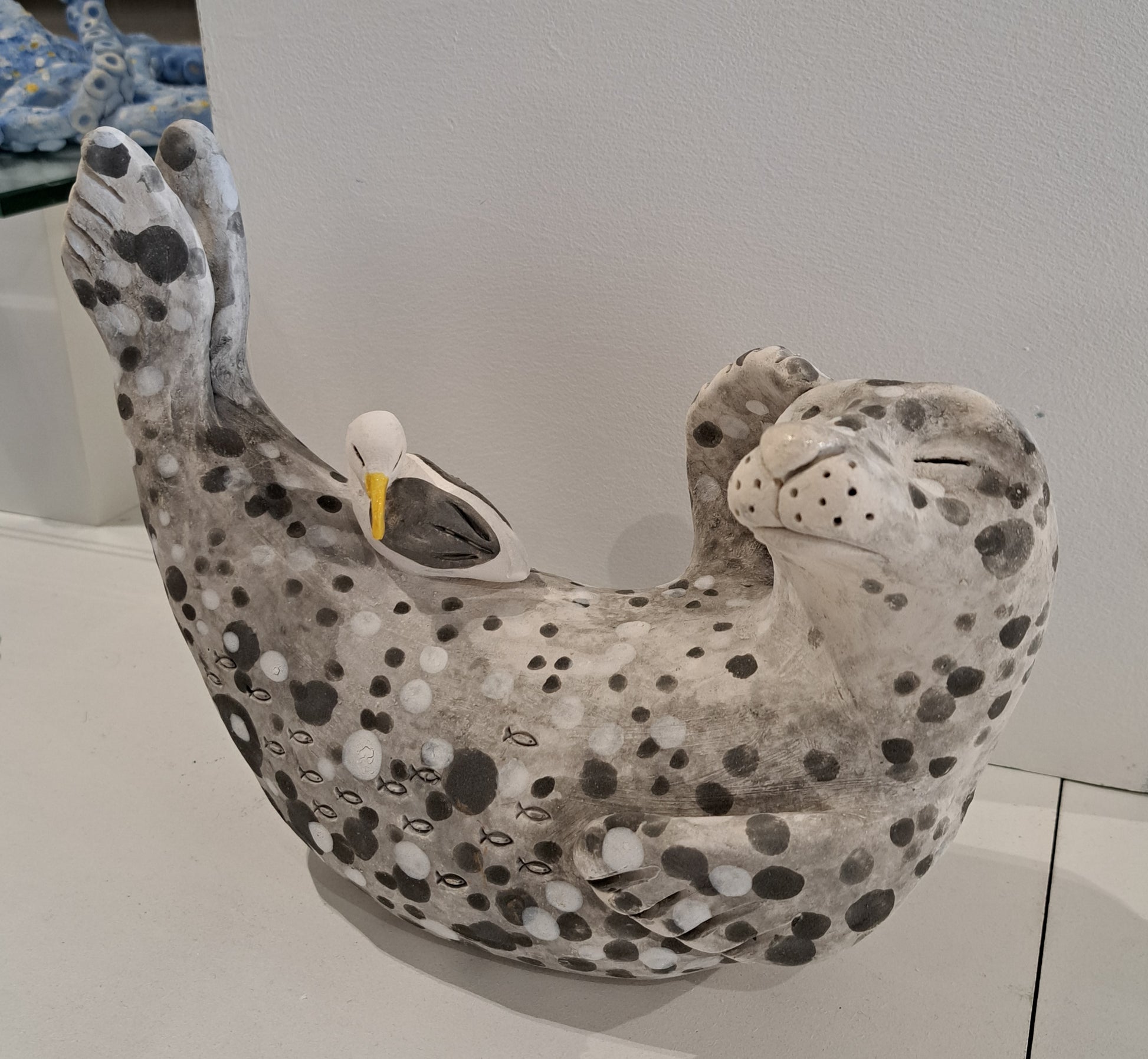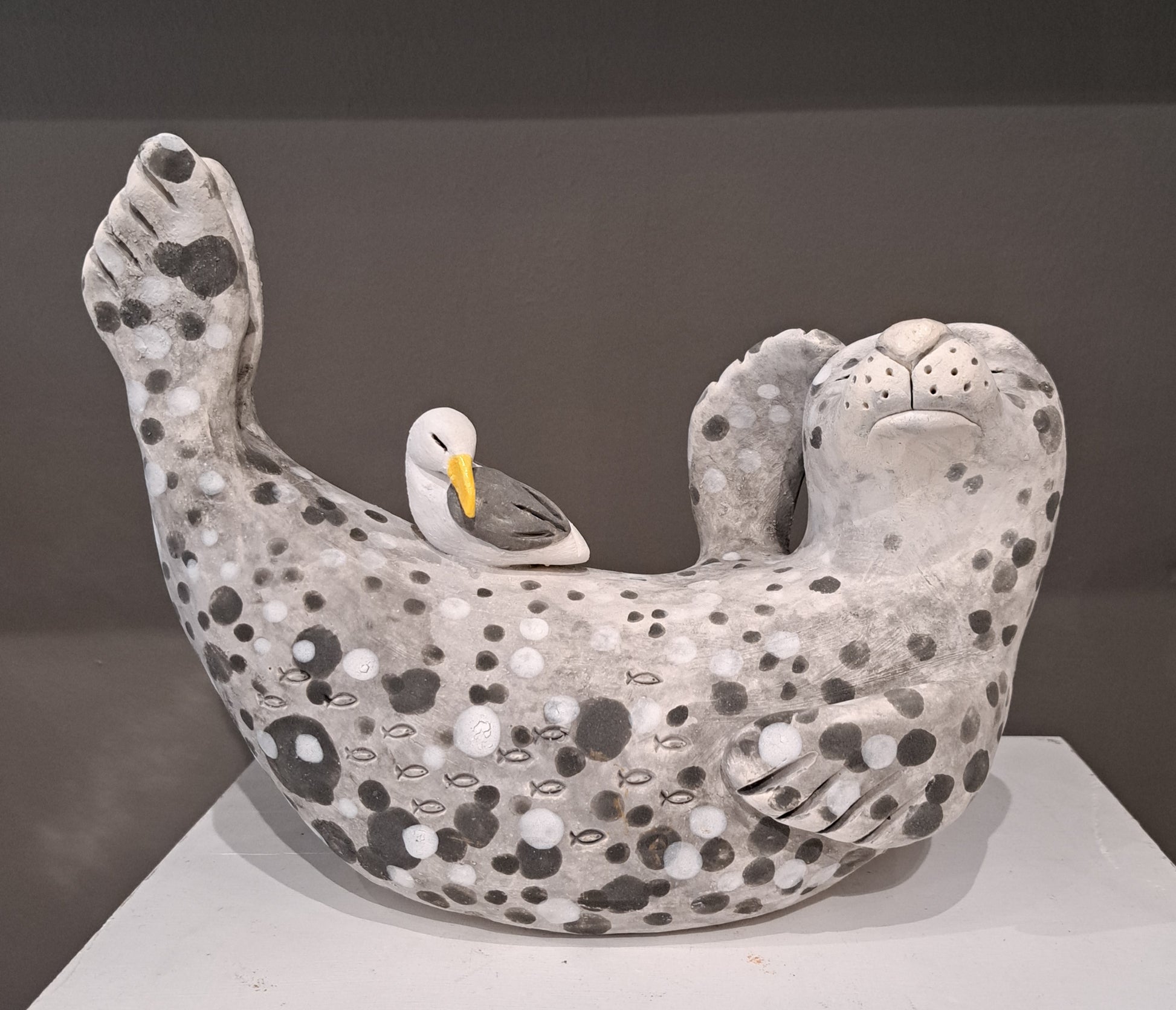 A charming grey seal taking a snooze with an equally sleepy gull resting on its tummy. Underglaze on earthenware clay. The perfect piece to have in your coastal home or retreat.