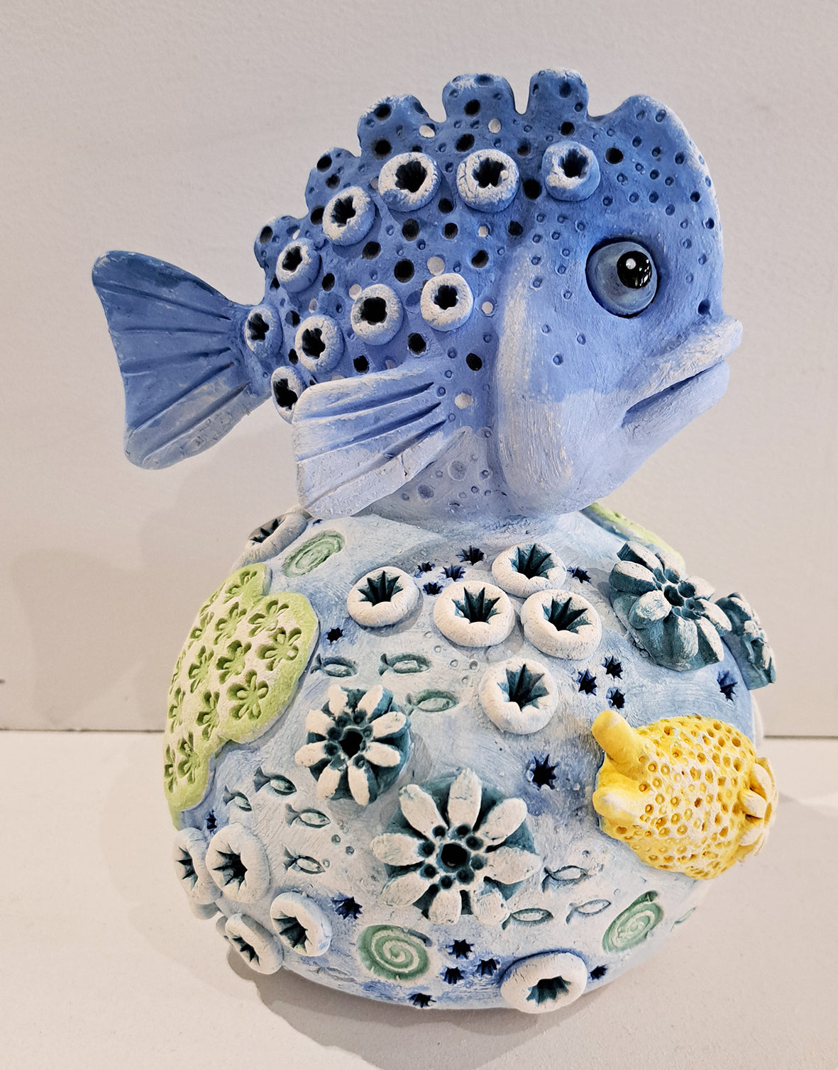 A lumpsucker fish on rock with sea slug and details, earthernware clay with various underglazes, perfect for a coastal home.