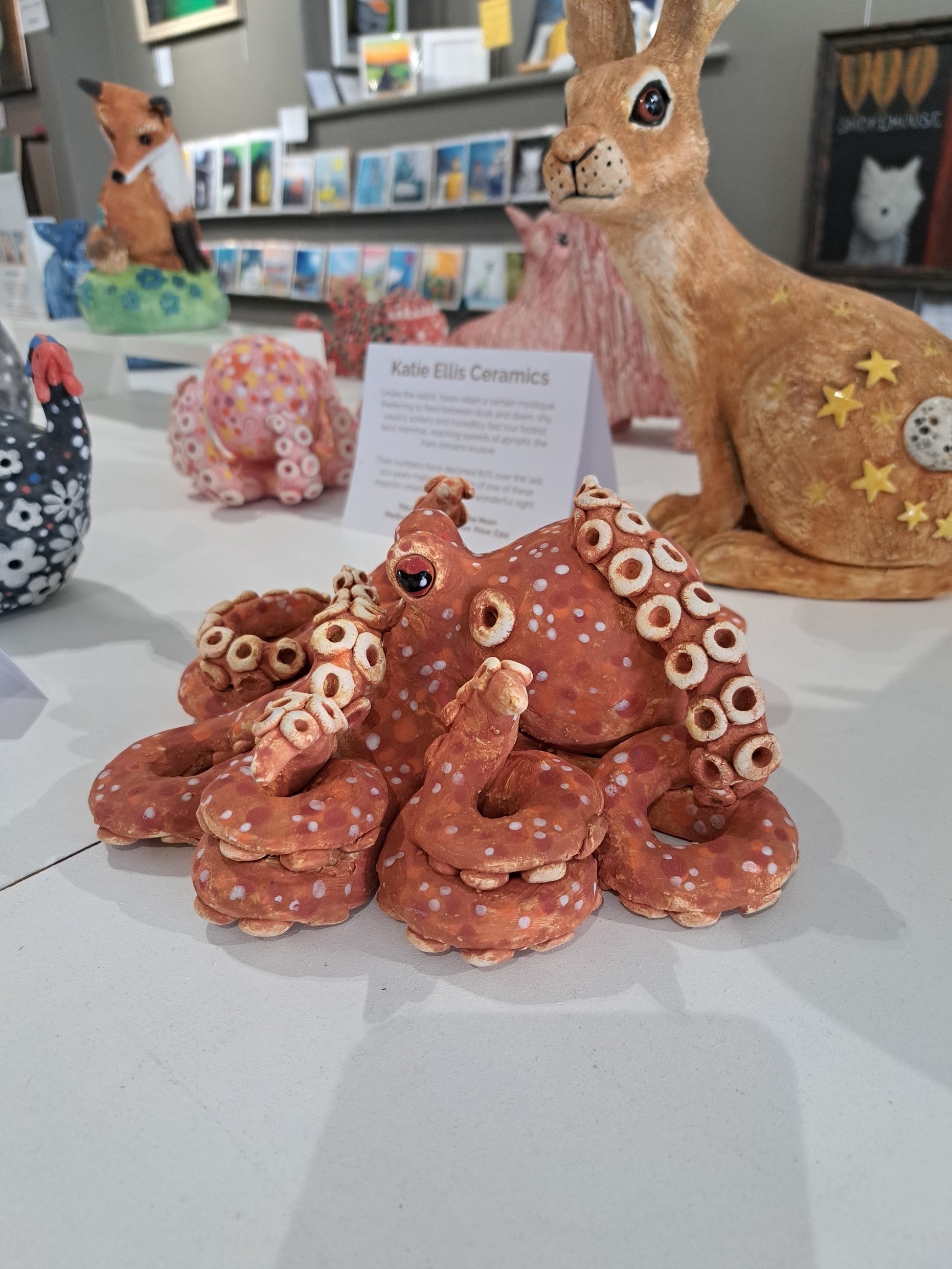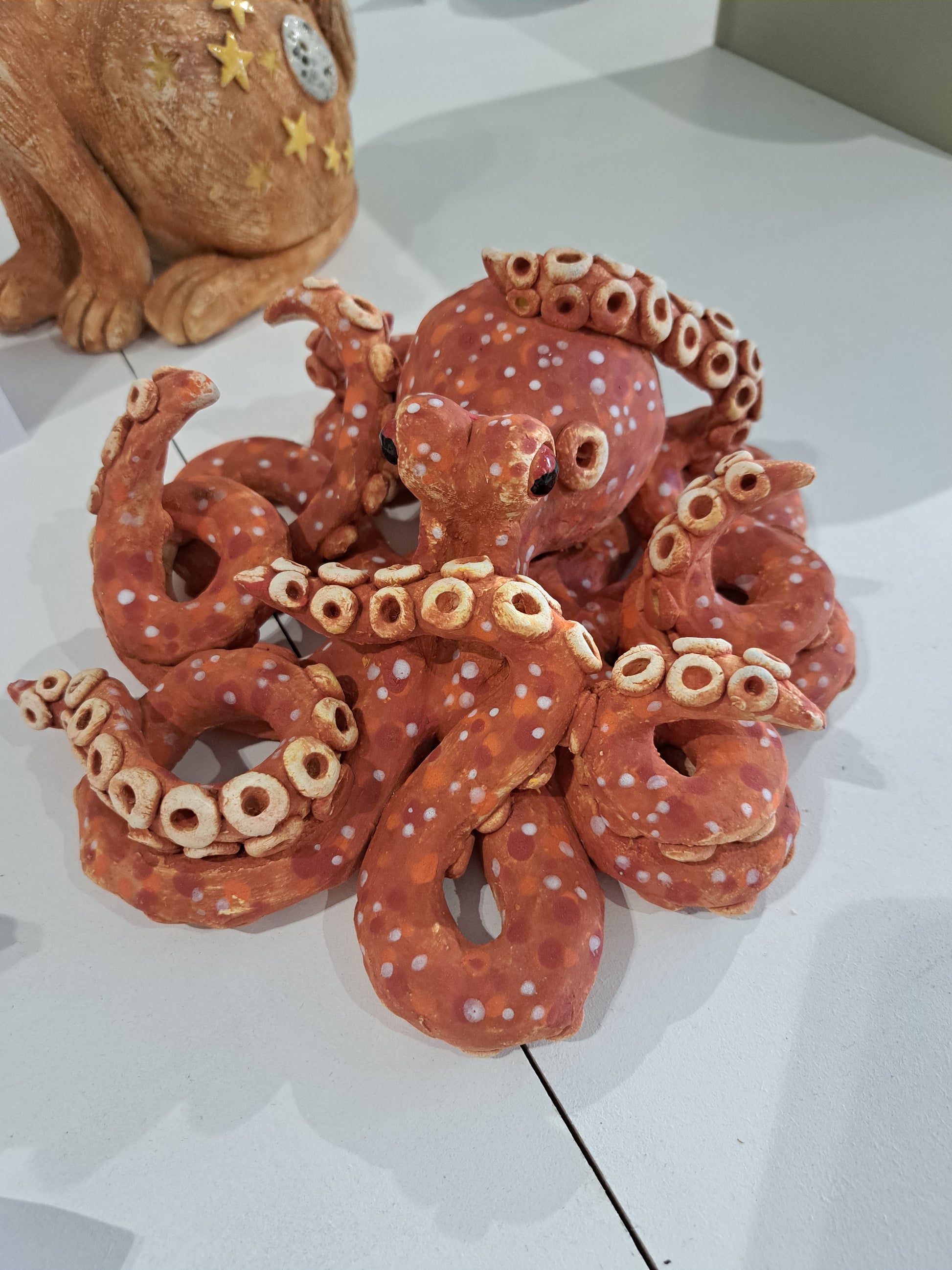 Orange octopus, earthernware clay in orange underglaze with its tentacles in , perfect for a coastal home, a statement sculpture for s beach house retreat.