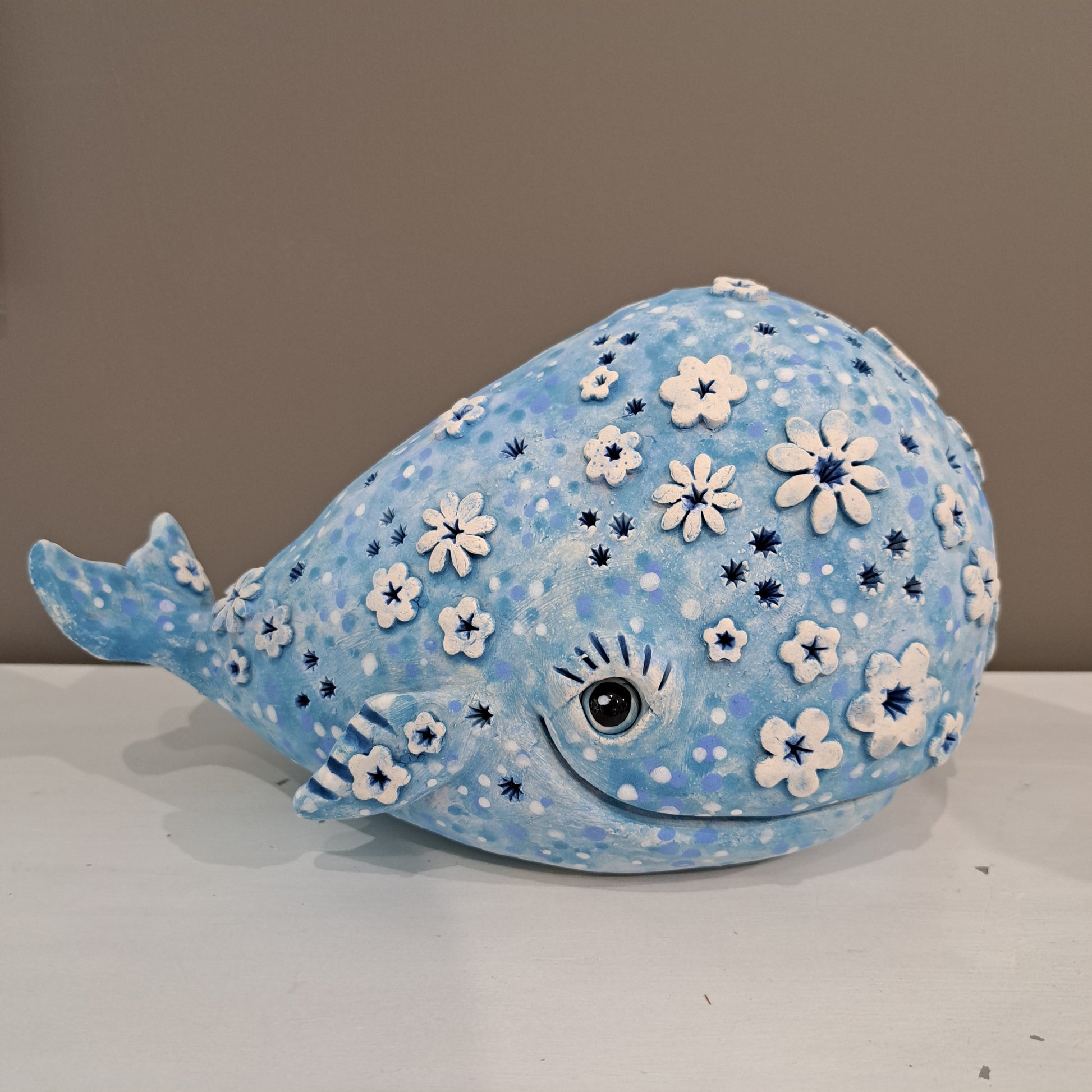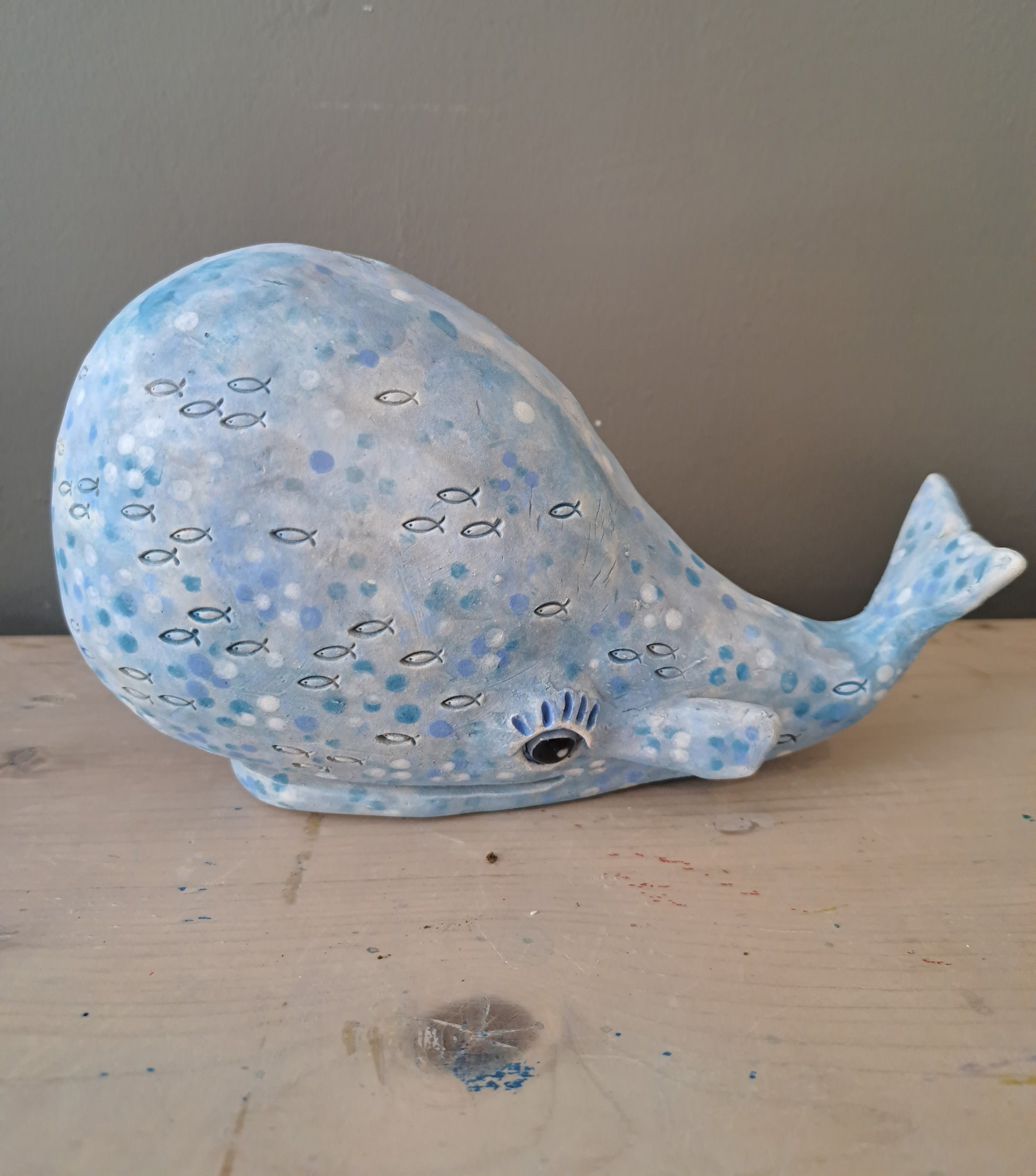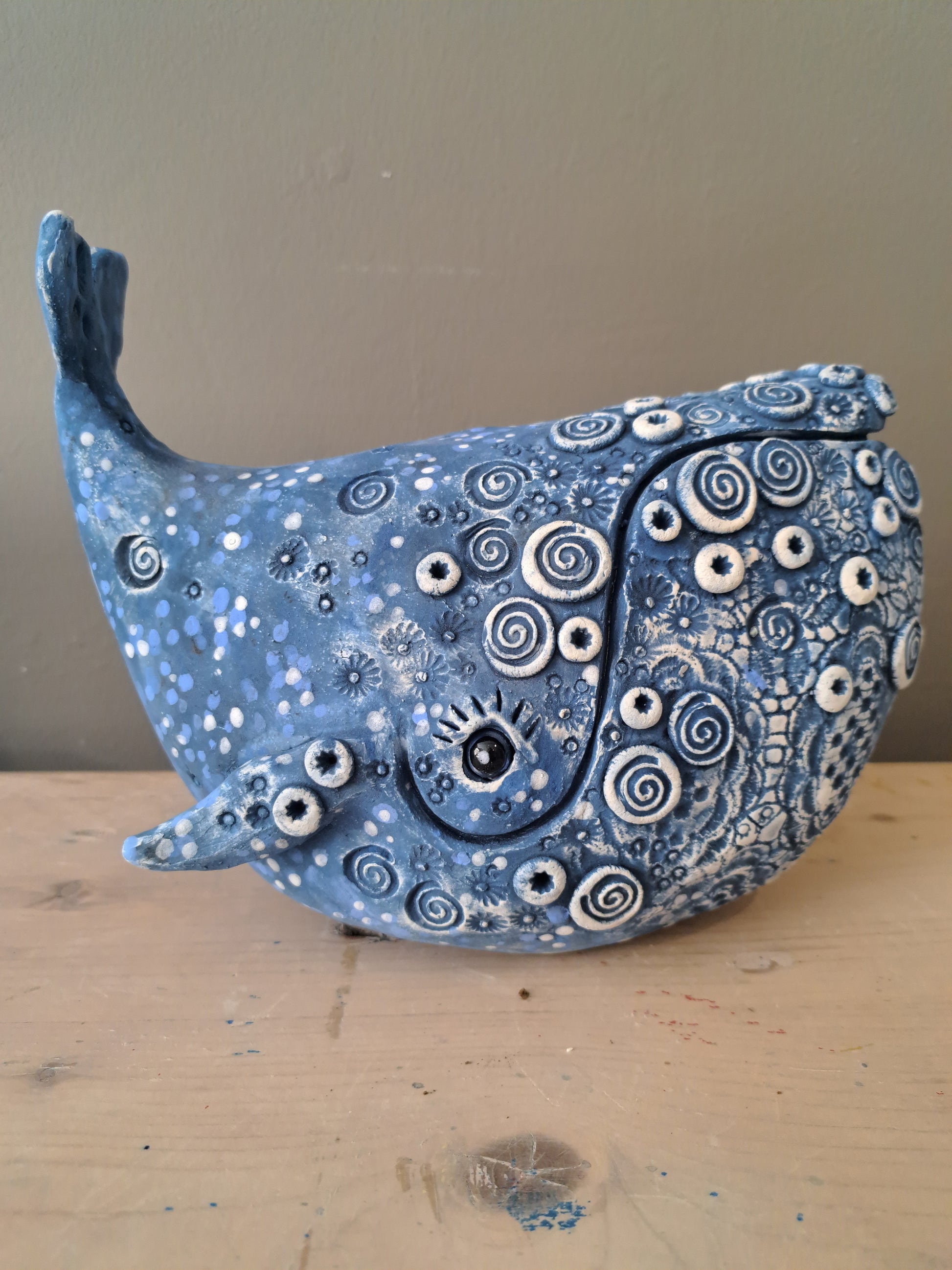 Blue character whales adorned with barnacles and decorations in blue underglaze on earthenware clay. The perfect piece to add to your coastal home interior or bathroom feature.