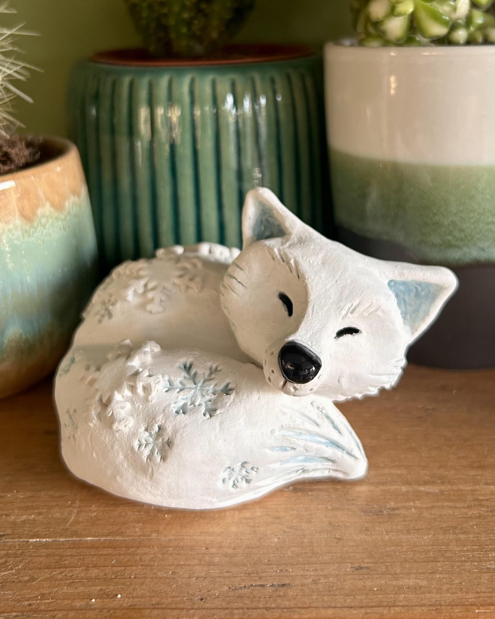 A snowy white arctic fox curled up ready for a winter nap - a perfect gift for animal lovers. Decorated with white and Pale blue underglaze on earthenware clay with snowflake embellishments.