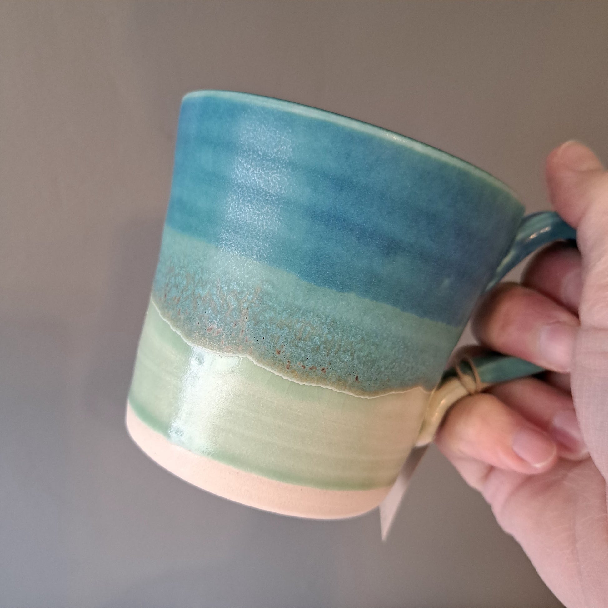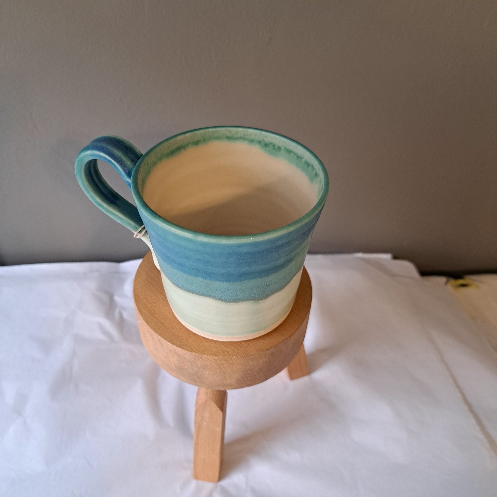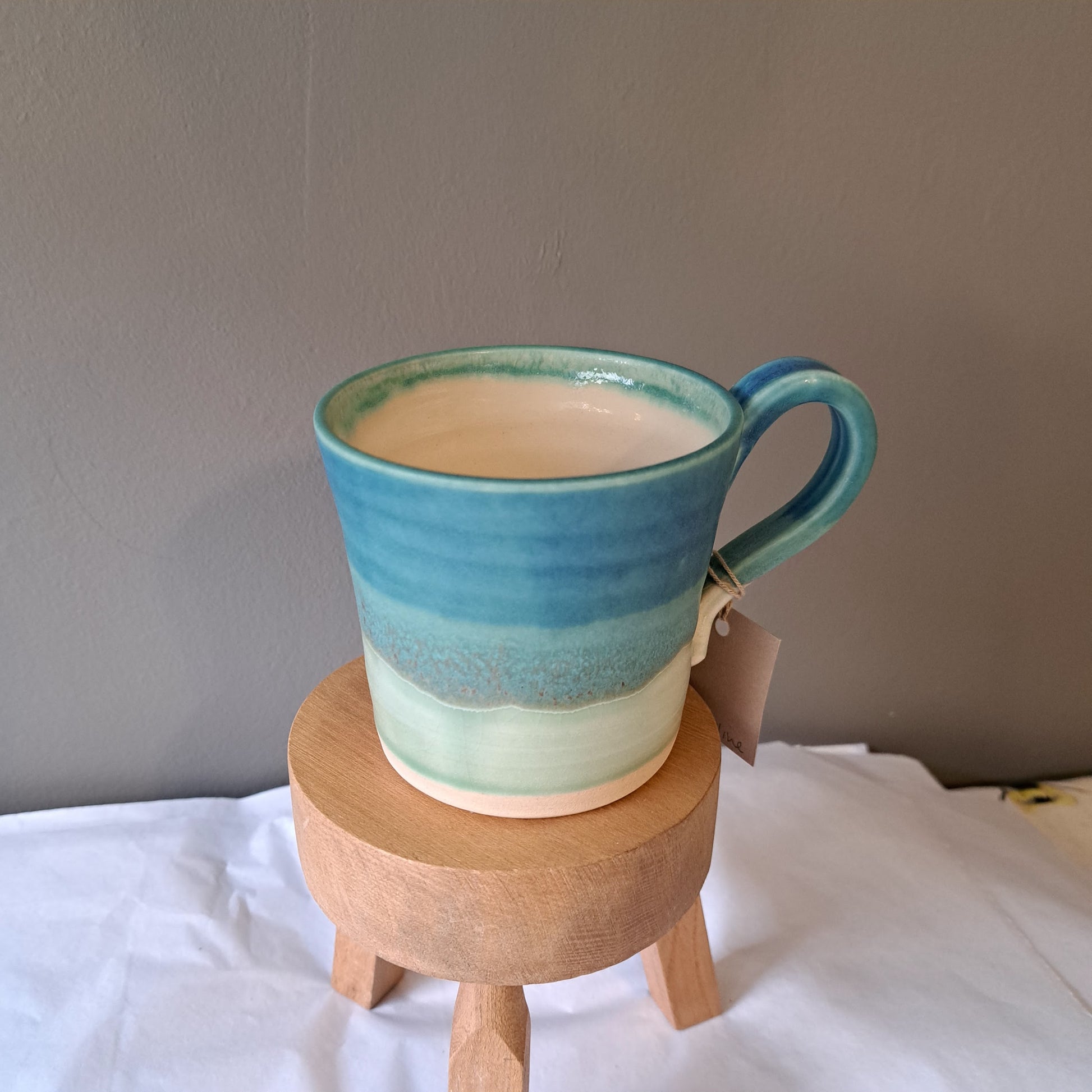 Hand thrown by Lorna in her Yorkshire garden studio, these stoneware mugs have been made using as few resources as possible. Decorated with a mix of green and turquoise glazes with a simple undulating design that reflects the pattern of the ocean and the sea shore. Part of the Skyline collection of pieces, all unique.
