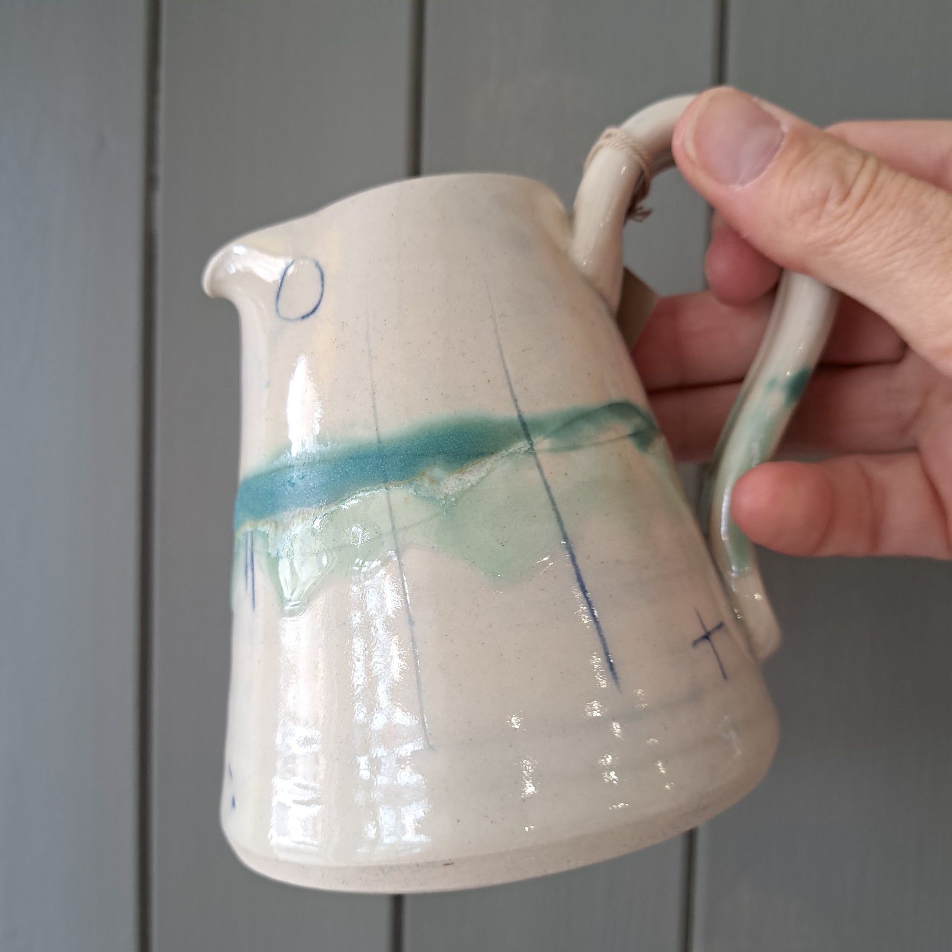 Hand thrown by Lorna in her Yorkshire garden studio, this white stoneware jug have been made using as few resources as possible. Decorated with a mix of green and turquoise glazes and featuring Lorna's signature leaping hare, each has a simple undulating design that reflects the pattern of the ocean and the sea shore. Part of the Seascape collection of pieces, all unique.