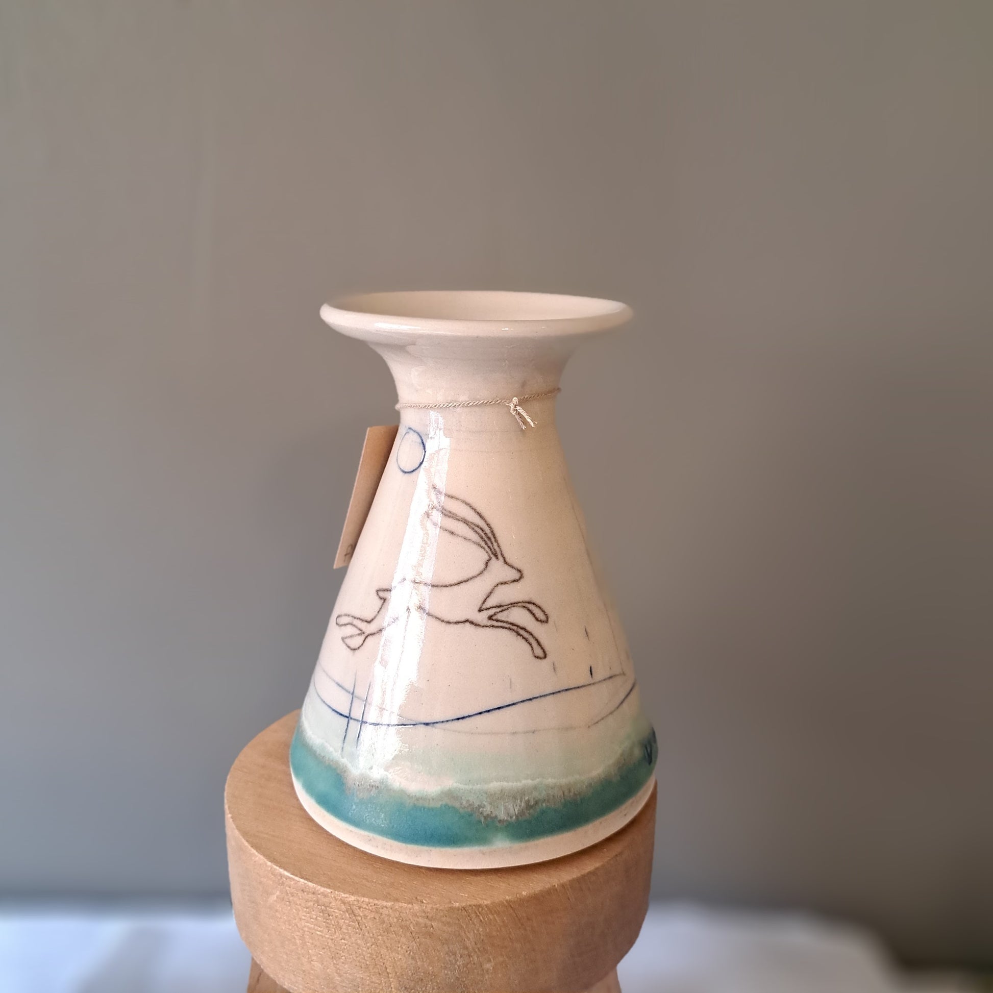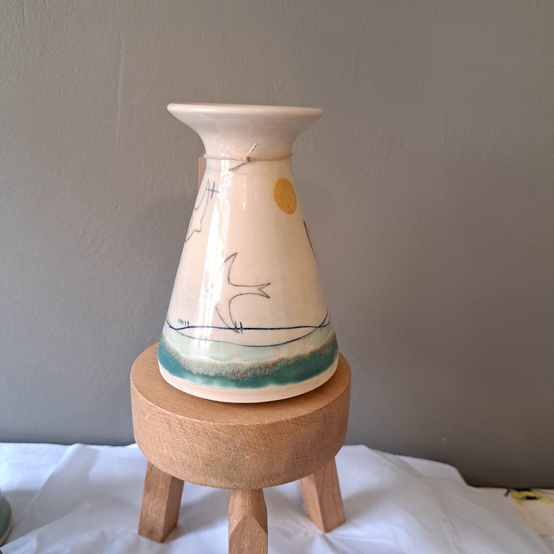 Hand thrown by Lorna in her Yorkshire garden studio, these white stoneware flared vases have been made using as few resources as possible. Decorated with a mix of green and turquoise glazes, each has a simple undulating design that reflects the pattern of the ocean and the sea shore.