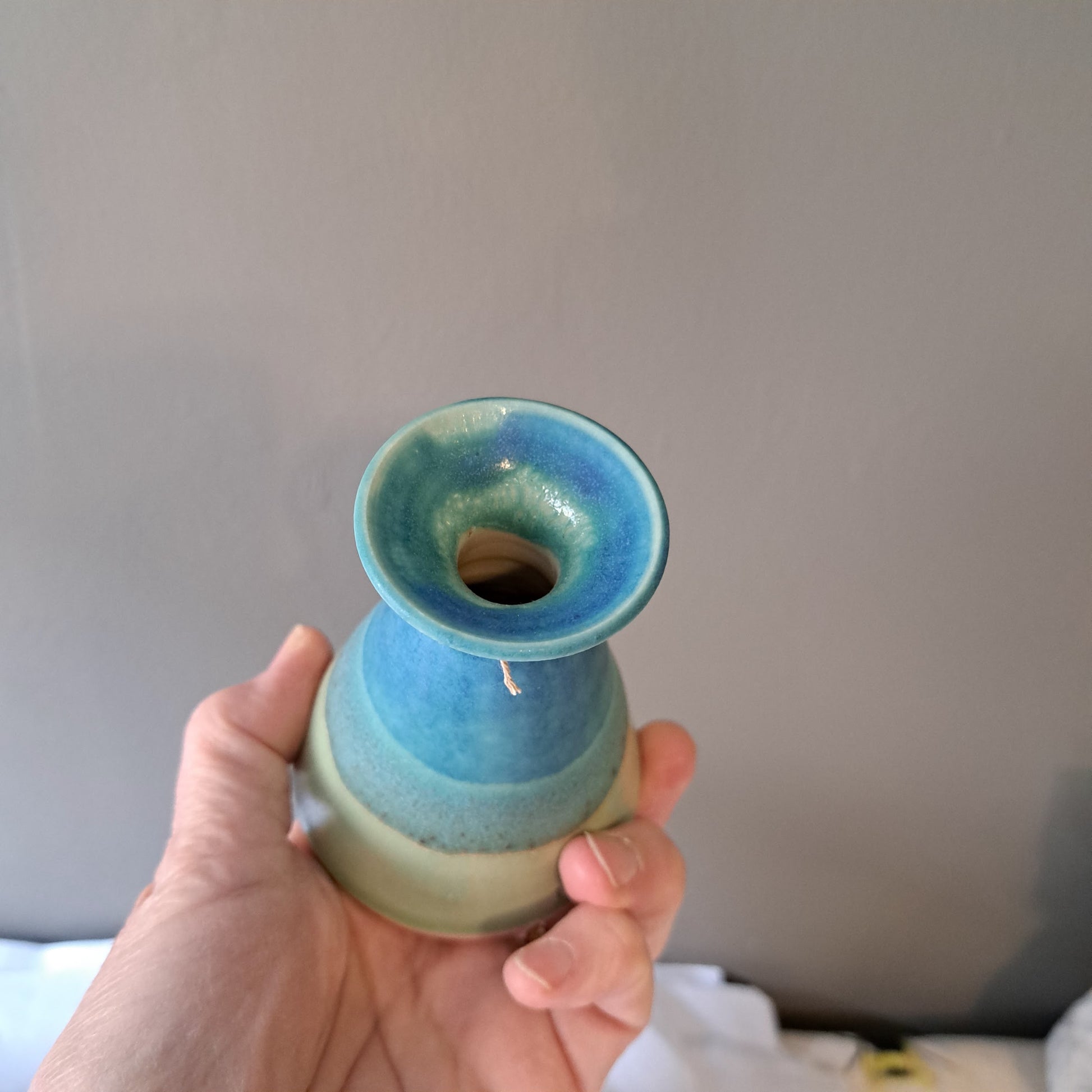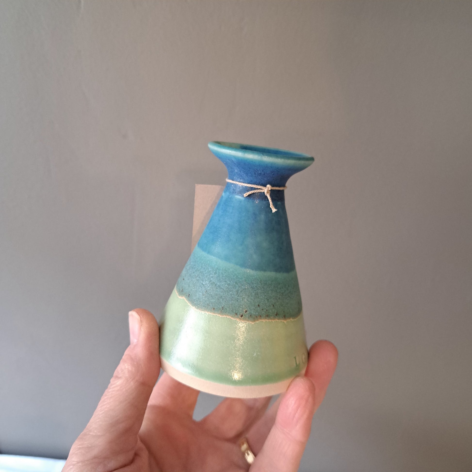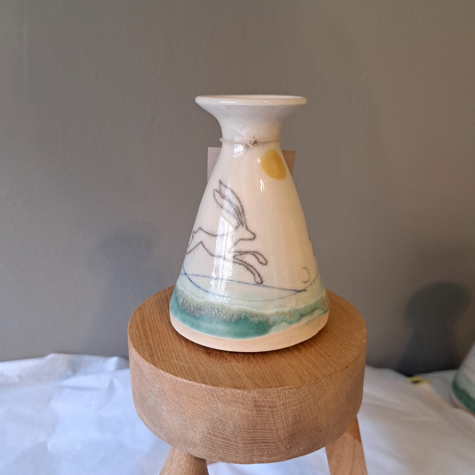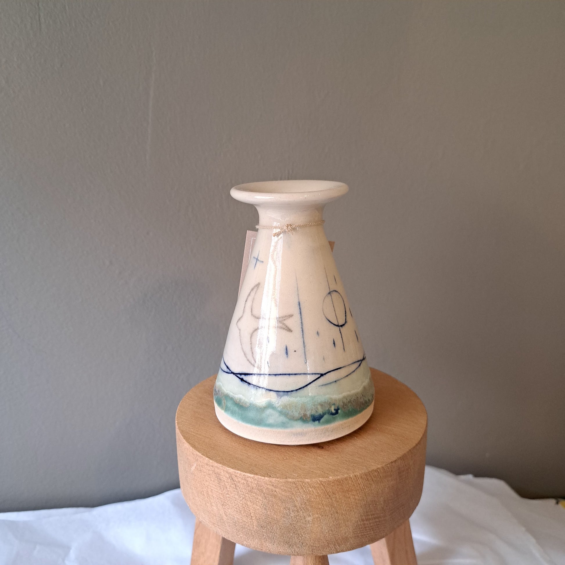 Hand thrown by Lorna in her Yorkshire garden studio, these white stoneware flared bud vases have been made using as few resources as possible. Decorated with a mix of green and turquoise glazes, each has a simple undulating design that reflects the pattern of the ocean and the sea shore, all unique.