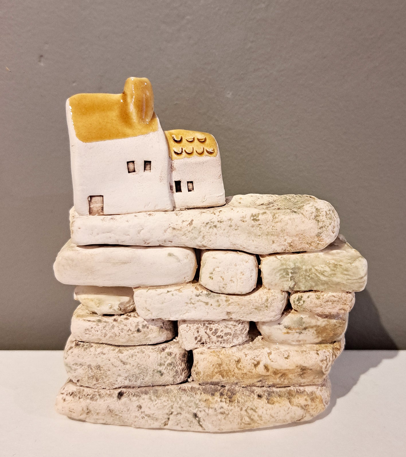 Each piece is sculpted from initial sketches then worked in earthenware clay. stones are individually made and textured to replicate old stone walling and then fired and glazed.