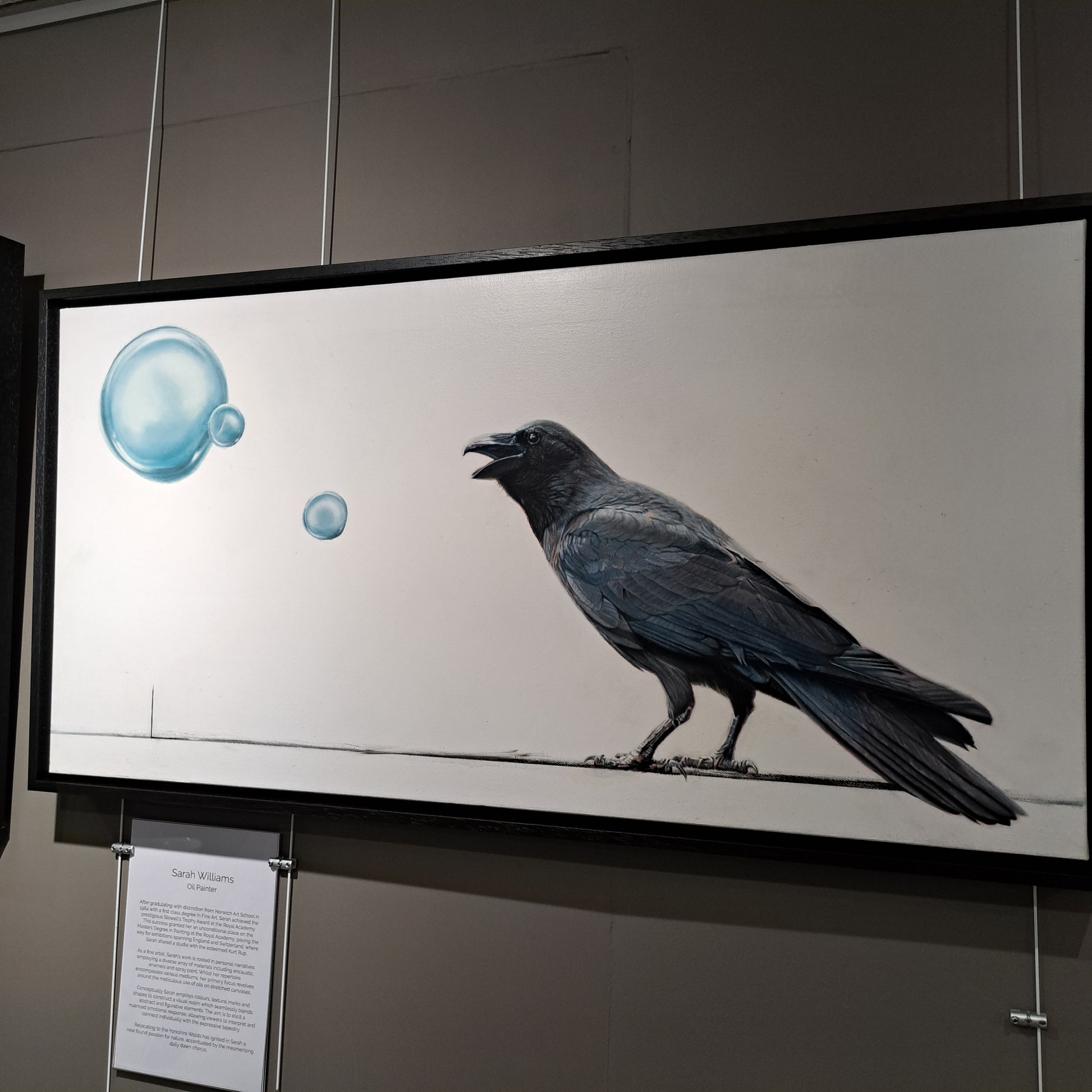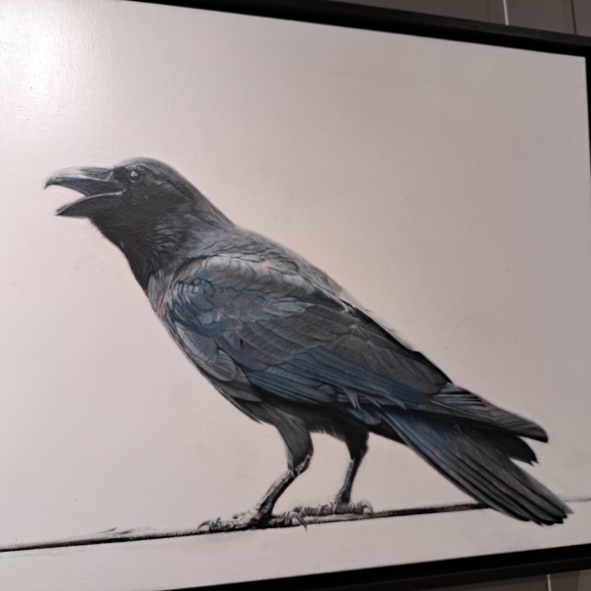 A stunning oil painting of a crow. Super realism of this amazing bird, on a distressed cream background with bubbles