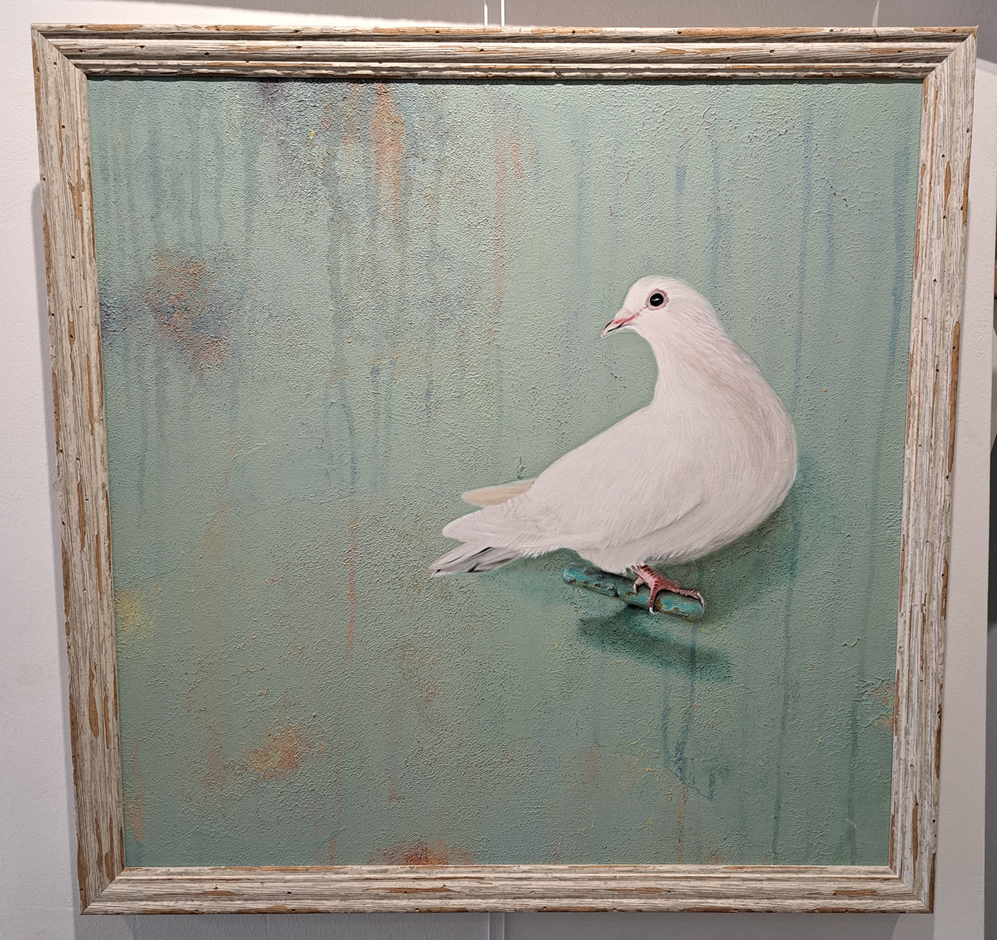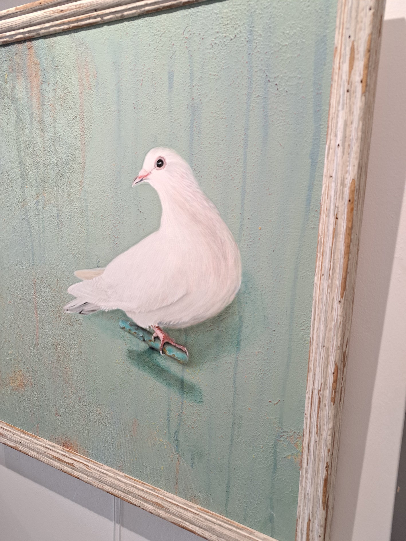A stunning oil painting of a dove. Super realism of this amazing bird, on a distressed cream sage/pastel green background with texture paint effect background stood on a handle.
