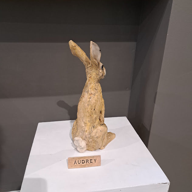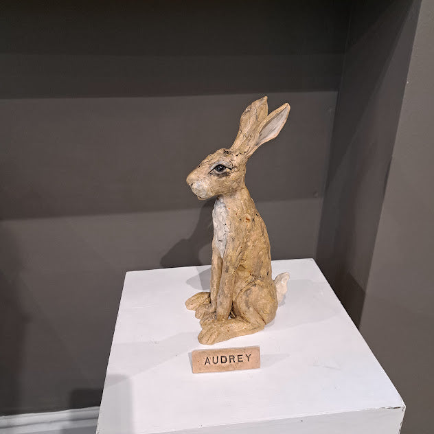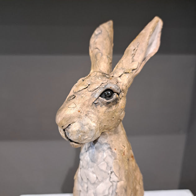 Beautifully sculptured earthenware hare by Sharon Westmoreland handmade in her Gristhorpe studio near the coastal town of Filey, North Yorkshire.