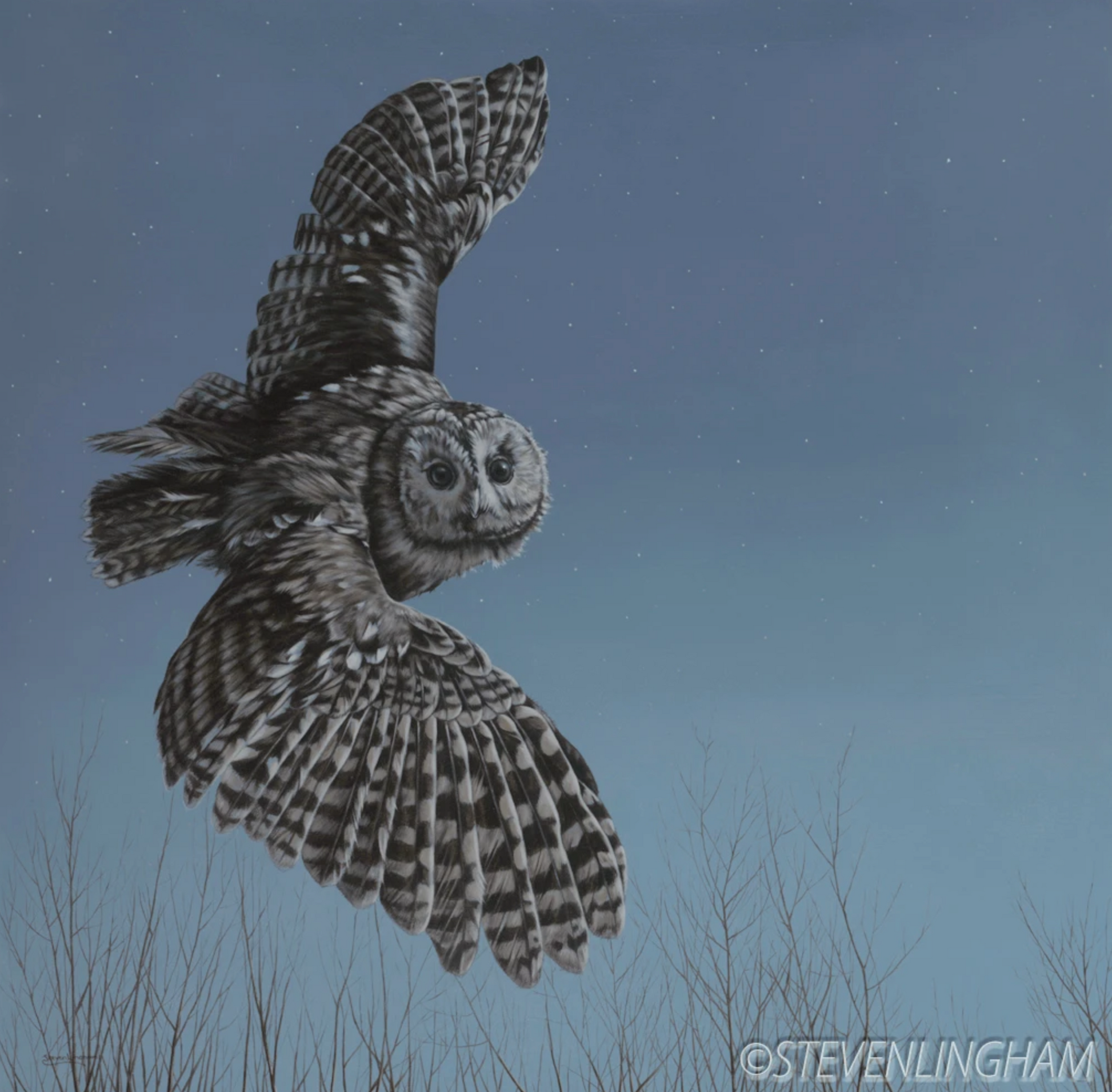 A contemporary oil painting of a tawny owl in flight, with the starry night sky.